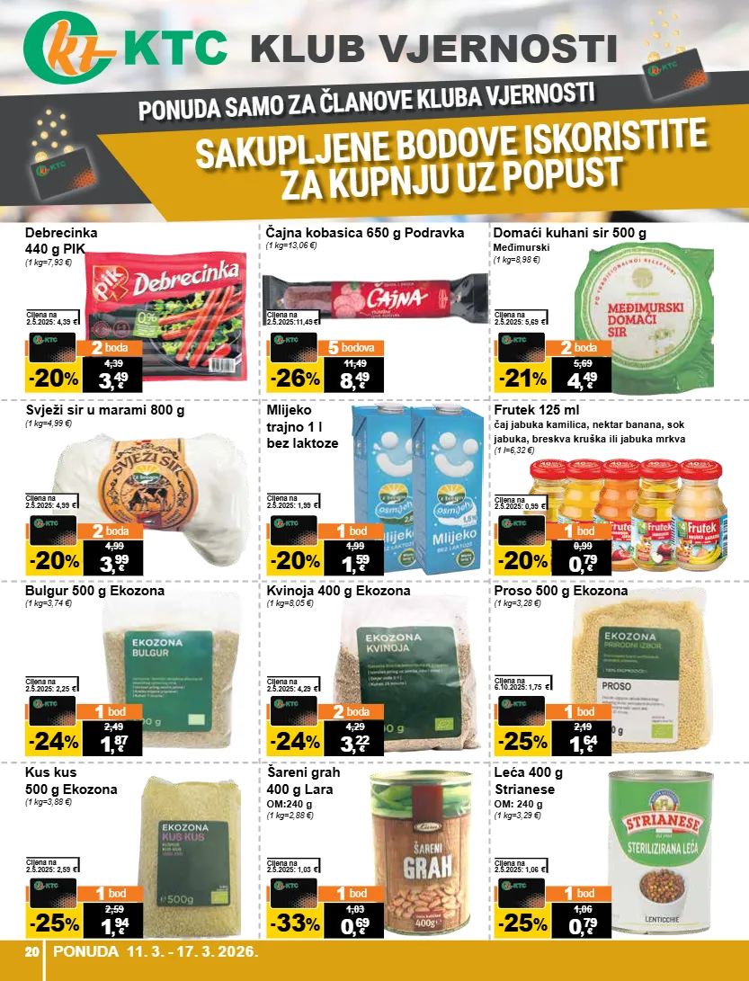 20 ponuda 17.9. - 23.9.2025. ponuda samo za članove kluba vjernosti sakupljene bodove iskoristite za kupnju uz popust klub vjernosti debrecinka 440 g pik (1 kg=7,93 €) 4,39 3 , 49 - 20 % 2 boda € cijena na 2.5.2025: 4,39 € čajna kobasica 650 g podravka (1 kg=13,06 €) 11,49 8 , 49 - 26 % 5 bodova € cijena na 2.5.2025:11,49 € domaći kuhani sir 500 g međimurski (1 kg=8,98 €) 5,69 4 , 49 - 21 % 2 boda € cijena na 2.5.2025: 5,69 € svježi sir u marami 800 g (1 kg=4,99 €) 4,99 3 , 99 - 20 % 2 boda € cijena na 2.5.2025: 4,99 € mlijeko trajno 1 l bez laktoze 1,99 1 , 59 - 20 % 1 bod € cijena na 2.5.2025: 1,99 € frutek 125 ml čaj jabuka kamilica, nektar banana, sok jabuka, breskva kruška ili jabuka mrkva (1 l=6,32 €) 0,99 0 , 79 - 20 % 1 bod € cijena na 2.5.2025: 0,99 € bulgur 500 g ekozona (1 kg=3,74 €) 2,49 1 , 87 - 24 % 1 bod € cijena na 2.5.2025: 2,25 € kvinoja 400 g ekozona (1 kg=8,05 €) 4,29 3 , 22 - 24 % 2 boda € cijena na 2.5.2025: 4,29 € proso 500 g ekozona (1 kg=3,28 €) 2,19 1 , 64 - 25 % 1 bod € cijena na 6.10.2025: 1,75 € kus kus 500 g ekozona (1 kg=3,88 €) 2,59 1 , 94 - 25 % 1 bod € cijena na 2.5.2025: 2,59 € šareni grah 400 g lara om:240 g (1 kg=2,88 €) 1,03 0 , 69 - 33 % 1 bod € cijena na 2.5.2025: 1,03 € leća 400 g strianese om: 240 g (1 kg=3,29 €) 1,06 0 , 79 - 25 % 1 bod € cijena na 2.5.2025: 1,06 € ponuda 11. 3. - 17. 3. 2026. 20