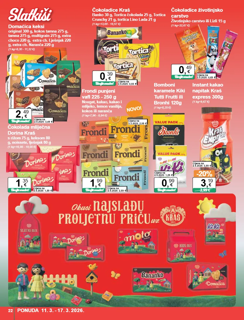 novo! domaćica keksi original 300 g, kokos tamna 275 g, tamna 275 g, multigrain 275 g, extra choco 220 g, extra ch. lješnjak 220 g, extra ch. naranča 220 g (1 kg=8,30 - 11,32 €) cijena na 2.5.2025: 3,49 € birajte mudro! 2 , 49 € čokoladice kraš banko 30 g, tortica čokolada 25 g, tortica crunchy 21 g, tortica lino lada 21 g (1 kg=13,00 - 18,57 €) cijena na 2.5.2025: 0,55 € birajte mudro! 0 , 39 € čokoladice životinjsko carstvo životinjsko carstvo ili lizli 15 g (1 kg=32,67 €) cijena na 2.5.2025: 0,69 € birajte mudro! 0 , 49 € čokolada mliječna dorina kraš s rižom 75 g, keksom 80 g, noissete, lješnjak 80 g (1 kg=16,88 - 18,00 €) cijena na 2.5.2025: 1,89 € birajte mudro! 1 , 35 € bomboni karamele kiki tutti frutti ili bronhi 120g (1 kg=8,25 €) cijena na 2.5.2025: 1,29 € birajte mudro! 0 , 99 € frondi punjeni vafl 225 - 250 g nougat, kakao, kakao i mlijeko, lemon vanilija, kokos ili naranča (1 kg=7,96 - 8,84 €) cijena na 2.5.2025: 2,59 € birajte mudro! 1 , 99 € cijena na 3.3.2025: 2,59 € instant kakao napitak kraš express 300g (1 kg=9,67 €) cijena na 2.5.2025: 3,99 € -20% 3,99 € 3 , 19 € ponuda 11. 3. - 17. 3. 2026. 22 slatkiši slatkiši