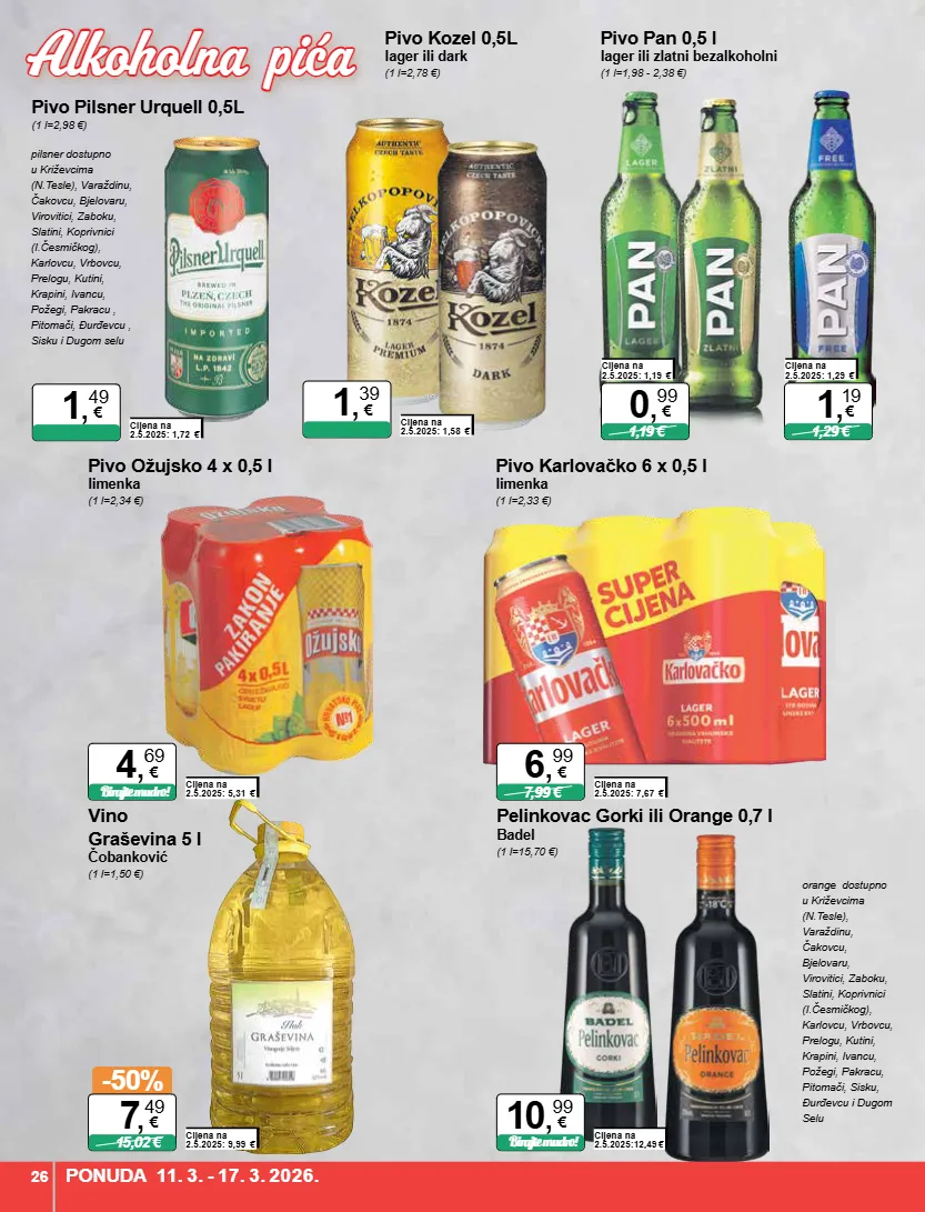 pivo karlovačko 6 x 0,5 l limenka (1 l=2,33 €) cijena na 2.5.2025: 7,67 € 7,99 € 6 , 99 € pivo ožujsko 4 x 0,5 l limenka (1 l=2,34 €) cijena na 2.5.2025: 5,31 € birajte mudro! 4 , 69 € pivo kozel 0,5l lager ili dark (1 l=2,78 €) cijena na 2.5.2025: 1,58 € 1 , 39 € pivo pilsner urquell 0,5l (1 l=2,98 €) cijena na 2.5.2025: 1,72 € 1 , 49 € pivo pan 0,5 l lager ili zlatni bezalkoholni (1 l=1,98 - 2,38 €) cijena na 2.5.2025: 1,19 € 1,19 € 0 , 99 € cijena na 2.5.2025: 1,29 € 1,29 € 1 , 19 € pilsner dostupno u križevcima (n.tesle), varaždinu, čakovcu, bjelovaru, virovitici, zaboku, slatini, koprivnici (i.česmičkog), karlovcu, vrbovcu, prelogu, kutini, krapini, ivancu, požegi, pakracu , pitomači, đurđevcu , sisku i dugom selu vino graševina 5 l čobanković (1 l=1,50 €) cijena na 2.5.2025: 9,99 € -50% 15,02 € 7 , 49 € pelinkovac gorki ili orange 0,7 l badel (1 l=15,70 €) cijena na 2.5.2025:12,49 € birajte mudro! 10 , 99 € orange dostupno u križevcima (n.tesle), varaždinu, čakovcu, bjelovaru, virovitici, zaboku, slatini, koprivnici (i.česmičkog), karlovcu, vrbovcu, prelogu, kutini, krapini, ivancu, požegi, pakracu, pitomači, sisku, đurđevcu i dugom selu ponuda 11. 3. - 17. 3. 2026. 26 alkoholna pića alkoholna pića