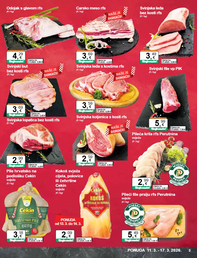 svinjska koljenica s kosti rfs (€ / kg) svinjska leđa bez kosti rfs (€ / kg) svinjski file vp pik (€ / kg) cijena na 2.5.2025: 5,99 € birajte mudro! 3 , 49 € cijena na 2.5.2025: 7,59 € birajte mudro! 5 , 99 € birajte mudro! 2 , 59 € cijena na 2.5.2025: 3,59 € svinjski but bez kosti rfs (€ / kg) cijena na 2.5.2025: 5,49 € birajte mudro! 3 , 69 € svinjska lopatica bez kosti rfs (€ / kg) carsko meso rfs (€ / kg) svinjska leđa s kostima rfs (€ / kg) cijena na 2.5.2025: 4,49 € birajte mudro! 2 , 99 € cijena na 2.5.2025: 4,29 € birajte mudro! 3 , 69 € cijena na 2.5.2025: 4,99 € birajte mudro! 3 , 59 € odojak s glavom rfs (€ / kg) cijena na 2.5.2025: 5,99 € birajte mudro! 4 , 29 € ponuda od 13. 3. do 14. 3. pileći file prsiju rfs perutnina svježe (€ / kg) cijena na 2.5.2025: 7,99 € birajte mudro! 5 , 49 € pileća krila rfs perutnina svježe (€ / kg) cijena na 2.5.2025: 3,99 € birajte mudro! 2 , 99 € pile hrvatsko na podlošku cekin svježe (€ / kg) cijena na 2.5.2025: 3,32 € birajte mudro! 3 , 18 € kokoš svježa cijela, polovice ili četvrtine cekin svježe (€ / kg) cijena na 2.5.2025: 3,45 € birajte mudro! 2 , 09 € ponuda 11. 3. - 17. 3. 2026. 3