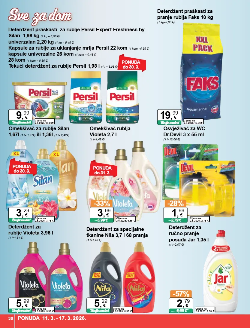 ponuda do 30. 3. ponuda do 30. 3. deterdžent praškasti za rublje persil expert freshness by silan 1,98 kg (1 kg = 6,06 €) univerzalan 2,20 kg (1 kg = 5,45 €) kapsule za rublje za uklanjanje mrlja persil 22 kom (1 kom =0,55 €) kapsule univerzalne 26 kom (1 kom = 0,46 €) 28 kom (1 kom = 0,36 €) tekući deterdžent za rublje persil 1,98 l (1 l = 6,06 €) cijena na 2.5.2025:16,99 € birajte mudro! 9 , 99 € omekšivač za rublje silan 1,67l (1 l= 1,97€) ili 1,36l (1 l= 2,42€) cijena na 2.5.2025: 3,79 € birajte mudro! 3 , 29 € deterdžent za specijalne tkanine nila 3,7 l 68 pranja (1 l=1,43 €) cijena na 2.5.2025: 6,99 € birajte mudro! 5 , 29 € deterdžent praškasti za pranje rublja faks 10 kg (1 kg=2,00 €) cijena na 2.5.2025:19,99 € birajte mudro! 19 , 99 € deterdžent za rublje violeta 3,96 l (1 l=1,51 €) cijena na 2.5.2025: 5,99 € birajte mudro! 5 , 99 € omekšivač rublja violeta 2,7 l (1 l=1,48 €) cijena na 2.5.2025: 5,99 € -33% 5,99 € 3 , 99 € ponuda do 31. 3. deterdžent za ručno pranje posuđa jar 1,35 l (1 l=2,07 €) cijena na 2.5.2025: 6,55 € -57% 6,55 € 2 , 79 € osvježivač za wc dr.devil 3 x 55 ml (1 l=12,06 €) cijena na 2.5.2025: 2,79 € -28% 2,79 € 1 , 99 € ponuda 11. 3. - 17. 3. 2026. 30 sve za dom sve za dom