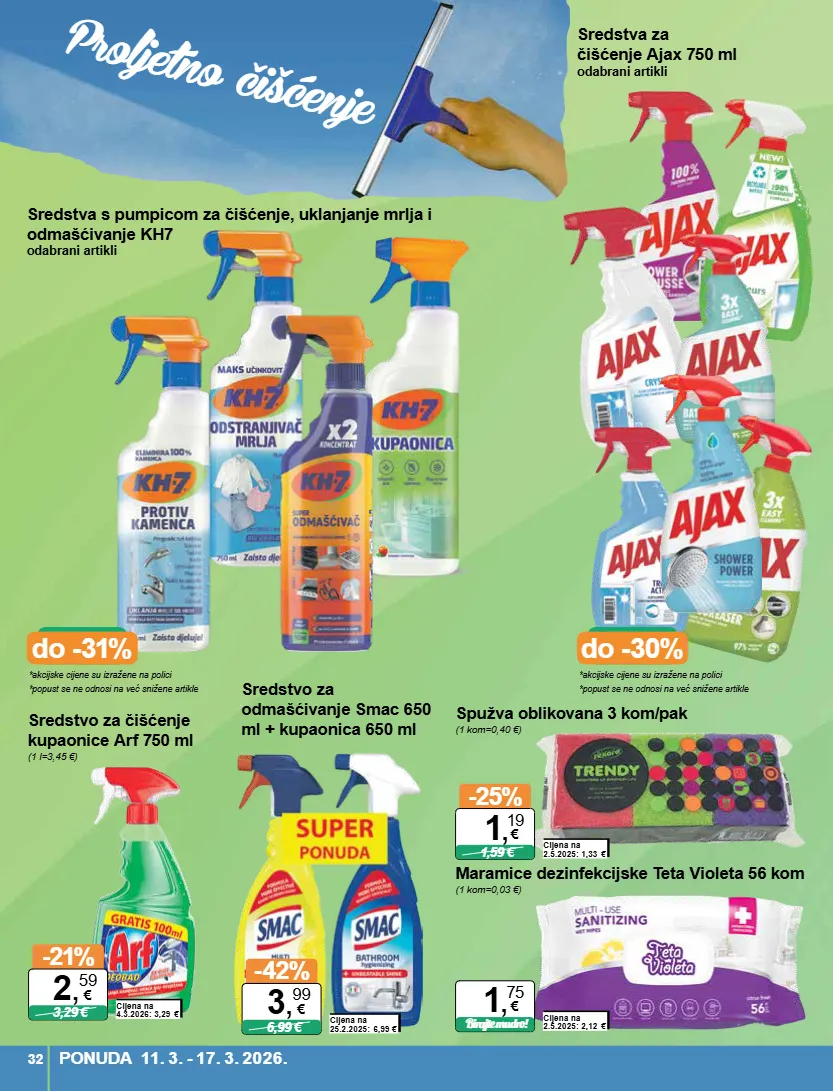 *akcijske cijene su izražene na polici *popust se ne odnosi na već snižene artikle do -30% *akcijske cijene su izražene na polici *popust se ne odnosi na već snižene artikle do -31% sredstva s pumpicom za čišćenje, uklanjanje mrlja i odmašćivanje kh7 odabrani artikl i sredstva za čišćenje ajax 750 ml odabrani artikli sredstvo za odmašćivanje smac 650 ml + kupaonica 650 ml cijena na 25.2.2025: 6,99 € -42% 6,99 € 3 , 99 € sredstvo za čišćenje kupaonice arf 750 ml (1 l=3,45 €) cijena na 4.3.2026: 3,29 € -21% 3,29 € 2 , 59 € spužva oblikovana 3 kom/pak (1 kom=0,40 €) cijena na 2.5.2025: 1,33 € -25% 1,59 € 1 , 19 € maramice dezinfekcijske teta violeta 56 kom (1 kom=0,03 €) cijena na 2.5.2025: 2,12 € birajte mudro! 1 , 75 € ponuda 11. 3. - 17. 3. 2026. 32 proljetno čišćenje