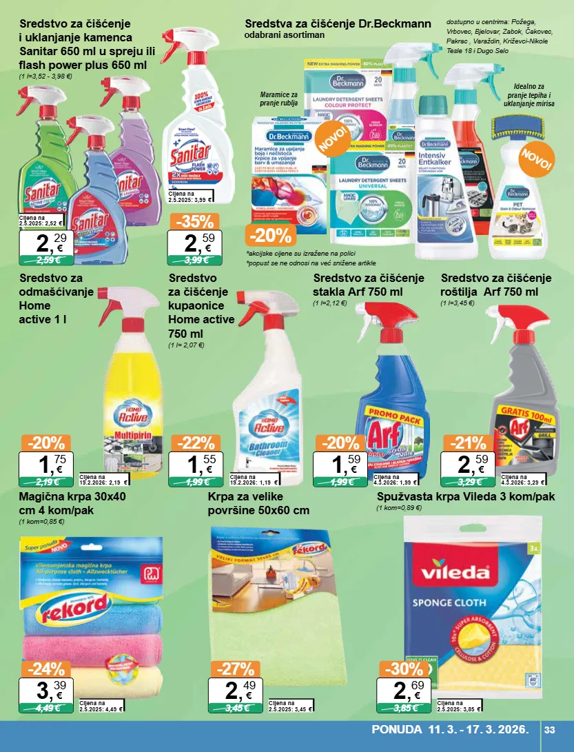 dostupno u centrima: požega, vrbovec, bjelovar, zabok, čakovec, pakrac , varaždin, križevci-nikole tesle 18 i dugo selo idealno za pranje tepiha i uklanjanje mirisa maramice za pranje rublja *akcijske cijene su izražene na polici *popust se ne odnosi na već snižene artikle -20% novo! novo! sredstvo za čišćenje i uklanjanje kamenca sanitar 650 ml u spreju ili flash power plus 650 ml (1 l=3,52 - 3,98 €) cijena na 2.5.2025: 2,52 € 2,59 € 2 , 29 € cijena na 2.5.2025: 3,99 € -35% 3,99 € 2 , 59 € sredstvo za odmašćivanje home active 1 l cijena na 19.2.2026: 2,19 € -20% 2,19 € 1 , 75 € sredstvo za čišćenje kupaonice home active 750 ml (1 l= 2,07 €) cijena na 19.2.2026: 1,19 € -22% 1,99 € 1 , 55 € sredstva za čišćenje dr.beckmann odabrani asortiman sredstvo za čišćenje stakla arf 750 ml (1 l=2,12 €) cijena na 4.3.2026: 1,99 € -20% 1,99 € 1 , 59 € sredstvo za čišćenje roštilja arf 750 ml (1 l=3,45 €) cijena na 4.3.2026: 3,29 € -21% 3,29 € 2 , 59 € magična krpa 30x40 cm 4 kom/pak (1 kom=0,85 €) cijena na 2.5.2025: 4,49 € -24% 4,49 € 3 , 39 € krpa za velike površine 50x60 cm cijena na 2.5.2025: 3,45 € -27% 3,45 € 2 , 49 € spužvasta krpa vileda 3 kom/pak (1 kom=0,89 €) cijena na 2.5.2025: 3,85 € -30% 3,85 € 2 , 69 € ponuda 11. 3. - 17. 3. 2026. 33