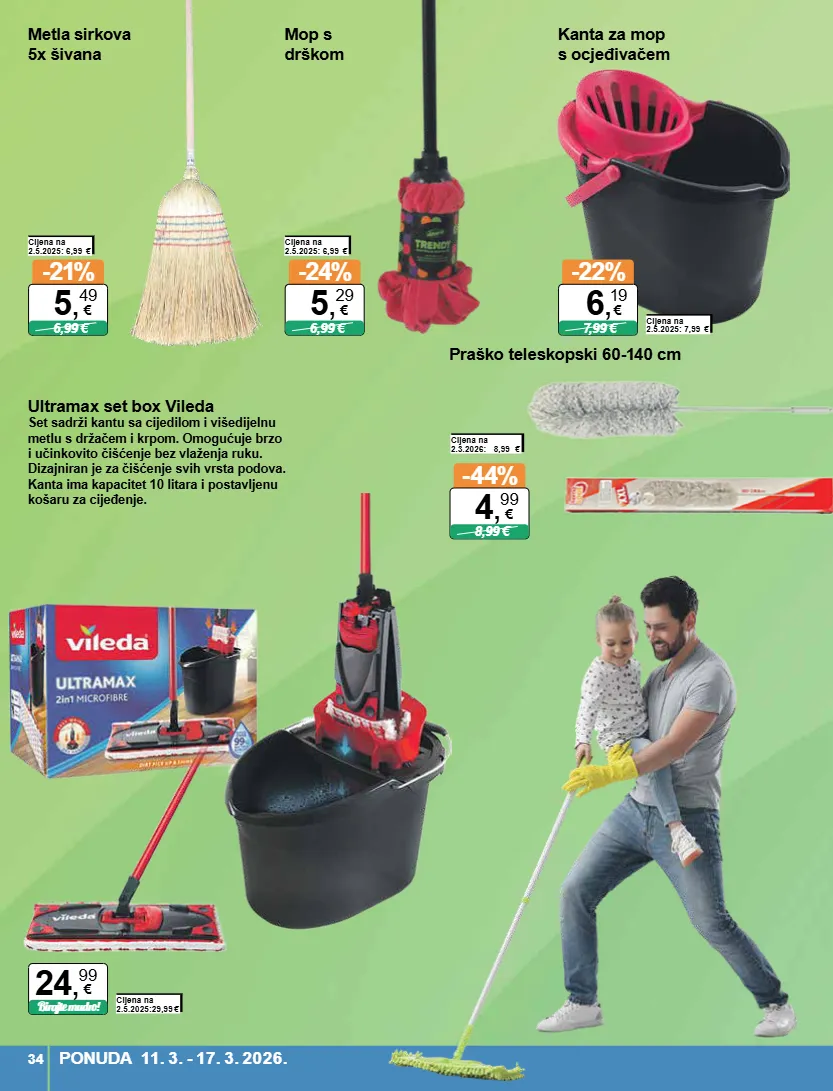 ultramax set box vileda set sadrži kantu sa cijedilom i višedijelnu metlu s držačem i krpom. omogućuje brzo i učinkovito čišćenje bez vlaženja ruku. dizajniran je za čišćenje svih vrsta podova. kanta ima kapacitet 10 litara i postavljenu košaru za cijeđenje. cijena na 2.5.2025:29,99 € birajte mudro! 24 , 99 € praško teleskopski 60-140 cm metla sirkova 5x šivana cijena na 2.5.2025: 6,99 € -21% 6,99 € 5 , 49 € -44% 8,99 € 4 , 99 € cijena na 2.3.2026: 8,99 € mop s drškom cijena na 2.5.2025: 6,99 € -24% 6,99 € 5 , 29 € kanta za mop s ocjeđivačem cijena na 2.5.2025: 7,99 € -22% 7,99 € 6 , 19 € ponuda 11. 3. - 17. 3. 2026. 34