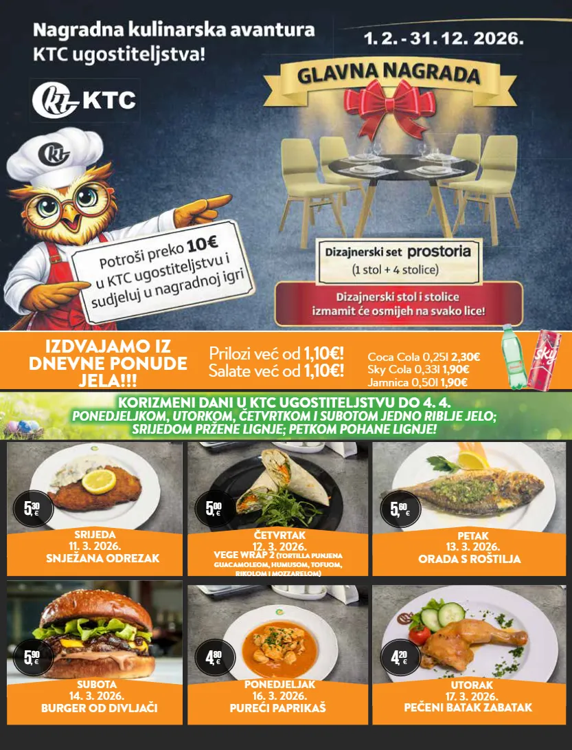 četvrtak 12. 3. 2026. zelena tjestenina s plodovima mora utorak 17. 3. 2026. ponedjeljak 16. 3. 2026. subota 14. 3. 2026. pureći paprikaš pečeni batak zabatak burger od divljači izdvajamo iz dnevne ponude jela!!! petak 13. 3. 2026. orada s roštilja 5 , 30 € 5 , 00 € 5 , 90 € 5, 60 € 4 , 20 € srijeda 11. 3. 2026. vege wrap 2 (tortilla punjena guacamoleom, humusom, tofuom, rikolom i mozzarelom) snježana odrezak coca cola 0,25l 2,30€ sky cola 0,33l 1,90€ jamnica 0,50l 1,90€ prilozi već od 1,10€! salate već od 1,10€! 4 , 80 € korizmeni dani u ktc ugostiteljstvu do 4. 4. ponedjeljkom, utorkom, četvrtkom i subotom jedno riblje jelo; srijedom pržene lignje; petkom pohane lignje!