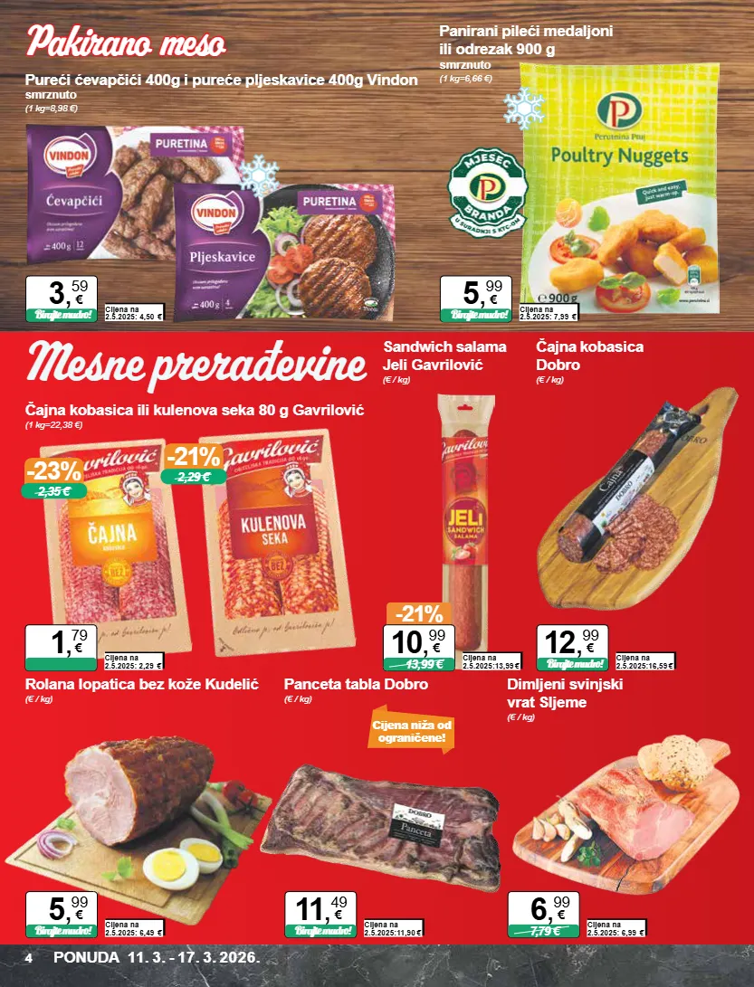 cijena niža od ograničene! -23% 2,35 € -21% 2,29 € čajna kobasica ili kulenova seka 80 g gavrilović (1 kg=22,38 €) cijena na 2.5.2025: 2,29 € 1 , 79 € sandwich salama jeli gavrilović (€ / kg) cijena na 2.5.2025:13,99 € -21% 13,99 € 10 , 99 € čajna kobasica dobro (€ / kg) cijena na 2.5.2025:16,59 € birajte mudro! 12 , 99 € rolana lopatica bez kože kudelić (€ / kg) cijena na 2.5.2025: 6,49 € birajte mudro! 5 , 99 € panceta tabla dobro (€ / kg) cijena na 2.5.2025:11,90 € birajte mudro! 11 , 49 € dimljeni svinjski vrat sljeme (€ / kg) cijena na 2.5.2025: 6,99 € 7,79 € 6 , 99 € panirani pileći medaljoni ili odrezak 900 g smrznuto (1 kg=6,66 €) cijena na 2.5.2025: 7,99 € birajte mudro! 5 , 99 € pureći ćevapčići 400g i pureće pljeskavice 400g vindon smrznuto (1 kg=8,98 €) cijena na 2.5.2025: 4,50 € birajte mudro! 3 , 59 € ponuda 11. 3. - 17. 3. 2026. 4 mesne prerađevine pakirano meso pakirano meso