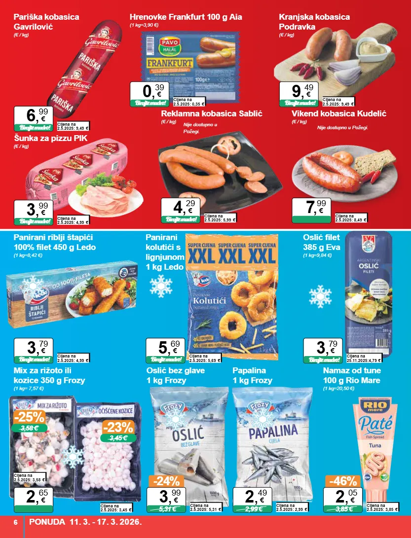 panirani riblji štapići 100% filet 450 g ledo (1 kg=8,42 €) cijena na 2.5.2025: 4,99 € birajte mudro! 3 , 79 € panirani kolutići s lignjunom 1 kg ledo cijena na 2.5.2025: 5,69 € birajte mudro! 5 , 69 € šunka za pizzu pik (€ / kg) cijena na 2.5.2025: 4,99 € birajte mudro! 3 , 99 € -25% 3,58 € -23% 3,45 € oslić filet 385 g eva (1 kg=9,84 €) cijena na 25.11.2025:4,79 € birajte mudro! 3 , 79 € oslić bez glave 1 kg frozy cijena na 2.5.2025: 5,31 € -24% 5,31 € 3 , 99 € papalina 1 kg frozy cijena na 2.5.2025: 2,99 € 2,99 € 2 , 49 € mix za rižoto ili kozice 350 g frozy (1 kg= 7,57 €) cijena na 2.5.2025: 3,58 € 2 , 65 € cijena na 2.5.2025: 3,45 € namaz od tune 100 g rio mare (1 kg=20,50 €) cijena na 2.5.2025: 3,85 € -46% 3,85 € 2 , 05 € hrenovke frankfurt 100 g aia (1 kg=3,90 €) cijena na 2.5.2025: 0,35 € birajte mudro! 0 , 39 € reklamna kobasica sablić (€ / kg) cijena na 2.5.2025: 5,99 € birajte mudro! 4 , 29 € nije dostupno u požegi. pariška kobasica gavrilović (€ / kg) cijena na 2.5.2025: 9,49 € birajte mudro! 6 , 99 € kranjska kobasica podravka (€ / kg) cijena na 2.5.2025: 9,49 € birajte mudro! 9 , 49 € vikend kobasica kudelić (€ / kg) cijena na 2.5.2025: 8,49 € 7 , 99 € nije dostupno u požegi. ponuda 11. 3. - 17. 3. 2026. 6