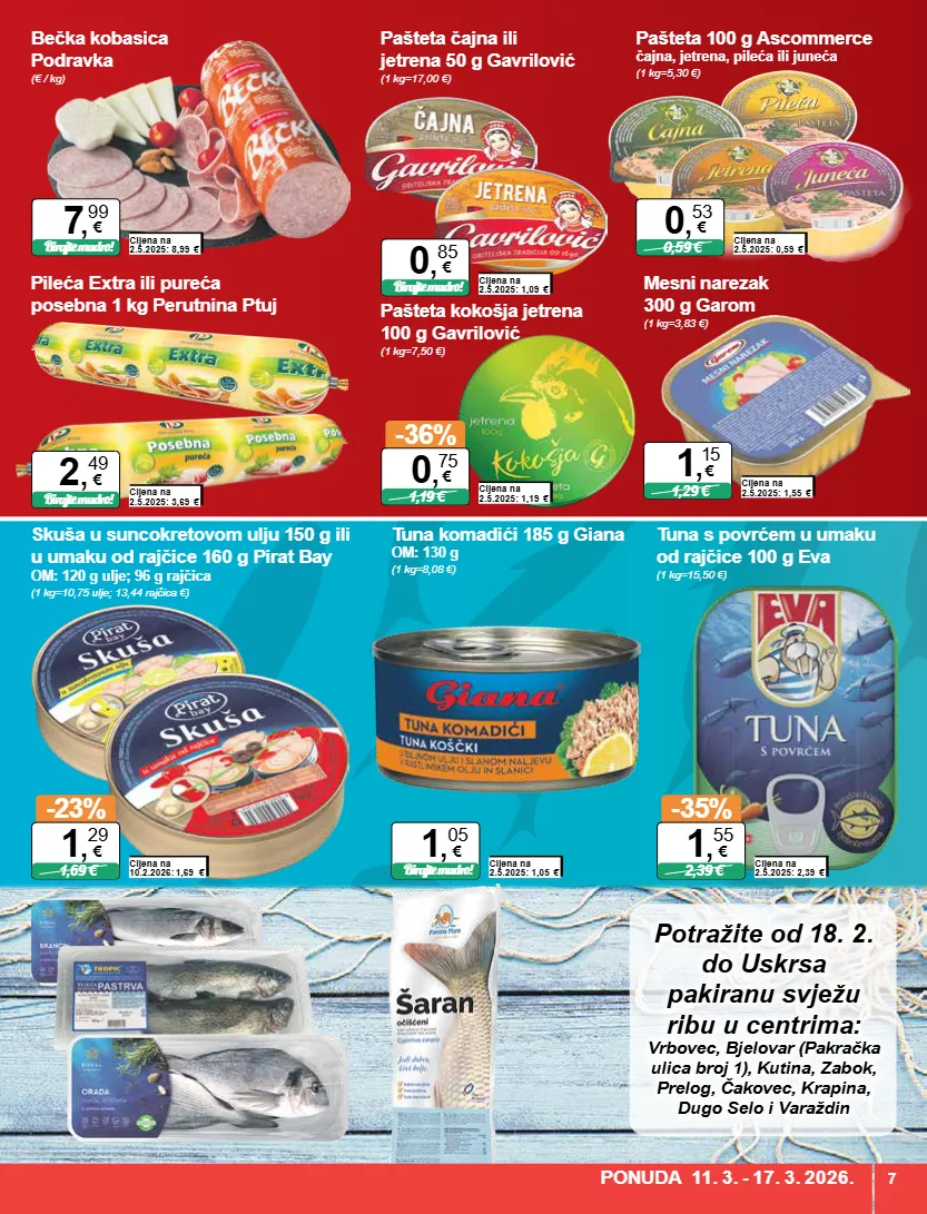 potražite od 18. 2. do uskrsa pakiranu svježu ribu u centrima: vrbovec, bjelovar (pakračka ulica broj 1), kutina, zabok, prelog, čakovec, krapina, dugo selo i varaždin pašteta čajna ili jetrena 50 g gavrilović (1 kg=17,00 €) cijena na 2.5.2025: 1,09 € birajte mudro! 0 , 85 € pašteta kokošja jetrena 100 g gavrilović (1 kg=7,50 €) cijena na 2.5.2025: 1,19 € -36% 1,19 € 0 , 75 € pašteta 100 g ascommerce čajna, jetrena, pileća ili juneća (1 kg=5,30 €) cijena na 2.5.2025: 0,59 € 0,59 € 0 , 53 € tuna komadići 185 g giana om: 130 g (1 kg=8,08 €) cijena na 2.5.2025: 1,05 € birajte mudro! 1 , 05 € tuna s povrćem u umaku od rajčice 100 g eva (1 kg=15,50 €) cijena na 2.5.2025: 2,39 € -35% 2,39 € 1 , 55 € skuša u suncokretovom ulju 150 g ili u umaku od rajčice 160 g pirat bay om: 120 g ulje; 96 g rajčica (1 kg=10,75 ulje; 13,44 rajčica €) cijena na 10.2.2026: 1,69 € -23% 1,69 € 1 , 29 € mesni narezak 300 g garom (1 kg=3,83 €) cijena na 2.5.2025: 1,55 € 1,29 € 1 , 15 € pileća extra ili pureća posebna 1 kg perutnina ptuj cijena na 2.5.2025: 3,69 € birajte mudro! 2 , 49 € bečka kobasica podravka (€ / kg) cijena na 2.5.2025: 8,99 € birajte mudro! 7 , 99 € ponuda 11. 3. - 17. 3. 2026. 7