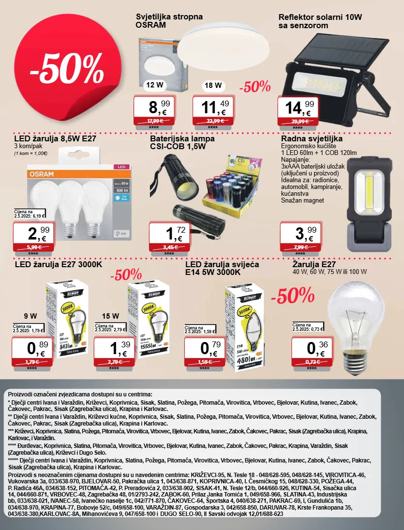 -50% 10 akcija 11. 3. - 17. 3. 2026. -50% proizvodi označeni zvjezdicama dostupni su u centrima: * dječji centri ivana i varaždin, križevci, koprivnica, sisak, slatina, požega, pitomača, virovitica, vrbovec, bjelovar, kutina, ivanec, zabok, čakovec, pakrac, sisak (zagrebačka ulica), krapina i karlovac. ** dječji centri ivana i varaždin, križevci kućne, koprivnica, sisak, slatina, požega, pitomača, virovitica, vrbovec, bjelovar, kutina, ivanec, zabok, čakovec, pakrac, sisak (zagrebačka ulica), krapina i karlovac. *** križevci, koprivnica, slatina, požega, pitomača, virovitica, vrbovec, bjelovar, kutina, ivanec, zabok, čakovec, pakrac, sisak (zagrebačka ulica), krapina, karlovac, i varaždin. **** đurđevac, koprivnica, slatina, pitomača, virovitica, vrbovec, bjelovar, kutina, ivanec, zabok, čakovec, pakrac, krapina, varaždin, sisak (zagrebačka ulica), križevci i dugo selo. ***** dječji centri ivana i varaždin, koprivnica, slatina, požega, pitomača, virovitica, vrbovec, bjelovar, kutina, ivanec, zabok, čakovec, pakrac, sisak (zagrebačka ulica), krapina i karlovac. proizvodi s neoznačenim cijenama dostupni su u navedenim centrima: križevci-95, n. tesle 18 - 048/628-595, 048/628-145, virovitica-46, vukovarska 3a, 033/638-970, bjelovar-50, pakračka ulica 1, 043/638-871, koprivnica-40, i. česmičkog 15, 048/628-330, požega-44, p. radića 46a, 034/638-152, pitomača-42, p. preradovića 2, 033/638-902, sisak-41, n. tesle 12/b, 044/660-926, kutina-54, sisačka ulica 14, 044/660-871, vrbovec-48, zagrebačka 48, 01/2793-242, zabok-60, prilaz janka tomića 1, 049/658-966, slatina-43, industrijska bb, 033/638-021, ivanec-58, ivanečko naselje 1c, 042/771-870, čakovec-64, športska 4, 040/638-271, pakrac-69, i, gundulića 1b, 034/638-970, krapina-77, bobovje 52/c, 049/658-100, varaždin-87, gospodarska 3, 042/658-850, daruvar-78, krste frankopana 35, 043/638-380,karlovac-8a, mihanovićeva 9, 047/658-100 i dugo selo-90, ii savski odvojak 12,01/688-623 -50% -50% -50% € 22,99 € 11 , 49 **** € 1,59 € 0 , 79 **** cijena na 2.5.2025: 1,59 € € 0,73 € 0 , 36 **** cijena na 2.5.2025: 0,73 € € 5,99 € 2 , 99 **** cijena na 2.5.2025: 6,19 € € 29,99 € 14 , 99 **** € 7,99 € 3 , 99 **** € 3,45 € 1 , 72 **** € 17,99 € 8 , 99 **** led žarulja e27 3000k cijena na 2.5.2025: 1,79 € € 1,79 € 0 , 89 **** 9 w cijena na 2.5.2025: 2,79 € € 2,79 € 1 , 39 **** 15 w led žarulja svijeća e14 5w 3000k žarulja e27 40 w, 60 w, 75 w ili 100 w led žarulja 8,5w e27 3 kom/pak (1 kom = 1,00€) reflektor solarni 10w sa senzorom svjetiljka stropna osram 12 w radna svjetiljka ergonomsko kućište 1 led 60lm + 1 cob 120lm napajanje: 3xaaa baterijski uložak (uključeni u proizvod) idealna za: radionice, automobil, kampiranje, kućanstva snažan magnet baterijska lampa csi-cob 1,5w 18 w