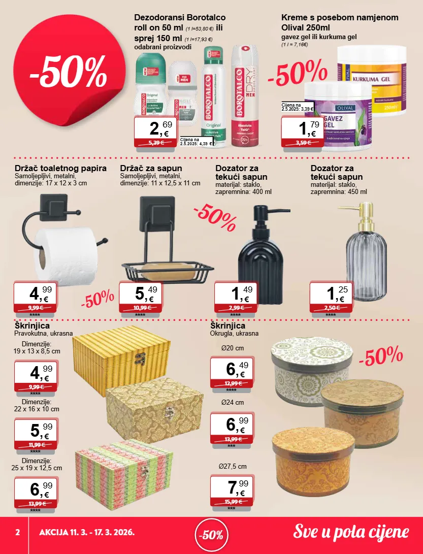 2 akcija 11. 3. - 17. 3. 2026. -50% -50% -50% -50% -50% -50% € 5,39 € 2 , 69 cijena na 2.5.2025: 4,39 € € 3,59 € 1 , 79 cijena na 2.5.2025: 3,39 € € 9,99 € 4 , 99 **** € 10,99 € 5 , 49 **** € 2,99 € 1 , 49 **** € 2,50 € 1 , 25 **** dezodoransi borotalco roll on 50 ml (1 l=53,80 €) ili sprej 150 ml (1 l=17,93 €) odabrani proizvodi kreme s posebom namjenom olival 250ml gavez gel ili kurkuma gel (1 l = 7,16€) držač toaletnog papira samoljepljivi, metalni, dimenzije: 17 x 12 x 3 cm držač za sapun samoljepljivi, metalni, dimenzije: 11 x 12,5 x 11 cm dozator za tekući sapun materijal: staklo, zapremnina: 400 ml dozator za tekući sapun materijal: staklo, zapremnina: 450 ml škrinjica okrugla, ukrasna € 12,99 € 6 , 49 **** ø20 cm € 13,99 € 6 , 99 *** ø24 cm € 15,99 € 7 , 99 *** ø27,5 cm škrinjica pravokutna, ukrasna € 9,99 € 4 , 99 **** dimenzije: 19 x 13 x 8,5 cm € 11,99 € 5 , 99 **** dimenzije: 22 x 16 x 10 cm € 13,99 € 6 , 99 **** dimenzije: 25 x 19 x 12,5 cm