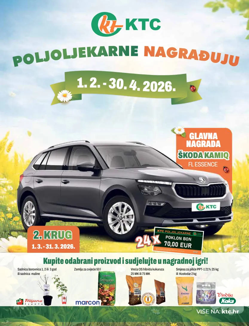 birajte mudro! 3 kupite odabrani proizvod i sudjelujte u nagradnoj igri! više na: ktc.hr 1 . 2 . - 3 0 . 4 . 2 0 2 6 . glavna nagrada fl essence 1. 3. - 31. 3. 2026. sadnica borovnica 1, 2 ili 3 god ili sadnica maline vreća os hibrida kukuruza 25 mk ili 75 mk smjesa za piliće ppt-1 21% 25 kg ili kostodar 2 kg zemlja za cvijeće 50 l