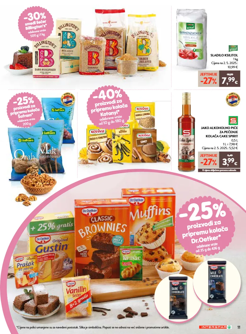 11 JEFTINIJE -27 % 5,49 3 , 99 € U cijenu uključena povratna naknada JAKO ALKOHOLNO PIĆE ZA PEČENJE KOLAČA CAKE SPIRIT 0,5 L 1 L = 7,98 € Cijena na 2. 5. 2025.: 5,52 € SLADILO KSILITOL 1 kg Cijena na 2. 5. 2025.: 10,99 € JEFTINIJE -27 % 10,99 7 , 99 € -25 % proizvodi za pripremu kolača Dr.Oetker* odabrane vrste od 35 g do 436 g -40 % proizvodi za pripremu kolača Kotanyi* odabrane vrste od 10 g do 180 g -25 % proizvodi za pripremu kolača Šafram* odabrane vrste 200 g -30 % smeđi šećer Billington’s* odabrane vrste 500 g i 1 kg *Cijene na polici umanjene su za navedeni postotak. Slika je simbolična. Popust se ne odnosi na već snižene i promotivne artikle.