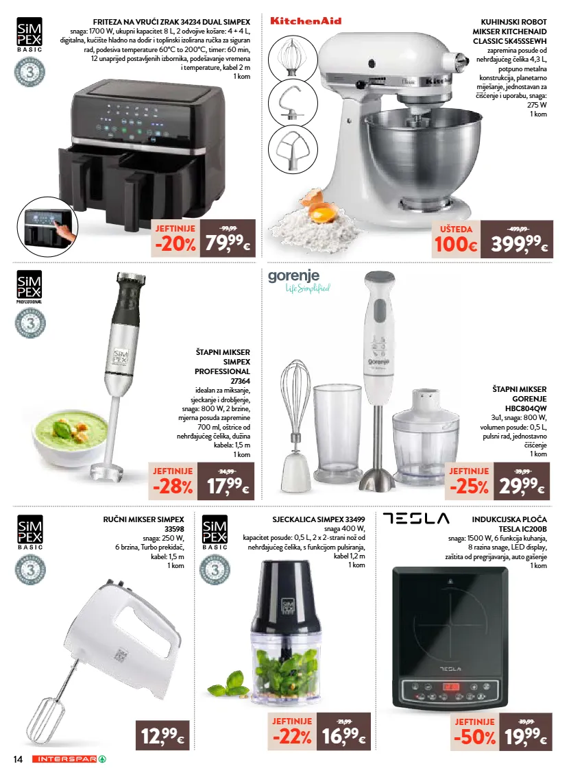 12 , 99 € jeftinije -20 % 99,99 79 , 99 € jeftinije -50 % 39,99 19 , 99 € jeftinije -25 % 39,99 29 , 99 € jeftinije -28 % 24,99 17 , 99 € jeftinije -22 % 21,99 16 , 99 € ušteda 100 € 499,99 399 , 99 € kuhinjski robot mikser kitchenaid classic 5k45ssewh zapremina posude od nehrđajućeg čelika 4,3 l, potpuno metalna konstrukcija, planetarno miješanje, jednostavan za čišćenje i uporabu, snaga: 275 w 1 kom indukcijska ploča tesla ic200b snaga: 1500 w, 6 funkcija kuhanja, 8 razina snage, led display, zaštita od pregrijavanja, auto gašenje 1 kom štapni mikser simpex professional 27364 idealan za miksanje, sjeckanje i drobljenje, snaga: 800 w, 2 brzine, mjerna posuda zapremine 700 ml, oštrice od nehrđajućeg čelika, dužina kabela: 1,5 m 1 kom sjeckalica simpex 33499 snaga 400 w, kapacitet posude: 0,5 l, 2 x 2-strani nož od nehrđajućeg čelika, s funkcijom pulsiranja, kabel 1,2 m 1 kom ručni mikser simpex 33598 snaga: 250 w, 6 brzina, turbo prekidač, kabel: 1,5 m 1 kom štapni mikser gorenje hbc804qw 3u1, snaga: 800 w, volumen posude: 0,5 l, pulsni rad, jednostavno čišćenje 1 kom friteza na vrući zrak 34234 dual simpex snaga: 1700 w, ukupni kapacitet 8 l, 2 odvojive košare: 4 + 4 l, digitalna, kućište hladno na dodir i toplinski izolirana ručka za siguran rad, podesiva temperature 60°c to 200°c, timer: 60 min, 12 unaprijed postavljenih izbornika, podešavanje vremena i temperature, kabel 2 m 1 kom 14