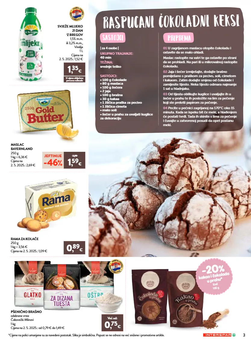 3 već od: 0 , 75 € 0 , 89 € svježe mlijeko 21 dan ‘z bregov 1,5% m.m. ili 3,2% m.m., vindija 1 l cijena na 2. 5. 2025.: 1,52 € maslac bayernland 250 g 1 kg = 6,36 € cijena na 2. 5. 2025.: 2,69 € pšenično brašno odabrane vrste čakovečki mlinovi 1 kg cijena na 2. 5. 2025.: od 0,79 € do 1,49 € rama za kolače 250 g 1 kg = 3,56 € cijena na 2. 5. 2025.: 1,09 € jeftinije -46 % 2,99 1 , 59 € 1 , 35 € u cijenu uključena povratna naknada -20 % kakao i čokolada u prahu* kraš 100 g raspucani čokoladni keksi | za 4 osobe | ukupno trajanje: 40 min težina: srednje teško sastojci: • 100 g čokolade • 80 g maslaca • 100 g šećera • 2 jaja • 100 g brašna • 30 g kakaa • 1 žličica praška za pecivo • 1 žličica cimeta • malo soli • šećer u prahu za uvaljati kuglice za dekoraciju 01 u zagrijanom maslacu otopite čokoladu i ostavite da se malo ohladi. maslac rastopite na vatri te ga ostavite po strani da se prohladi. na pari ili u mikrovalnoj rastopite čokoladu. 02 jaja i šećer izmiješajte, dodajte brašno pomiješano s praškom za pecivo, soli, cimetom i kakaom. zatim dodajte smjesu od čokolade i zamijesite tijesto. neka tijesto odmara najmanje 1 sat u hladnjaku. 03 od tijesta oblikujte kuglice i uvaljajte ih u šećer u prahu te ih posložite na lim za pečenje koji ste prekrili papirom za pečenje. 04 pecite u pećnici zagrijanoj na 170°c oko 15 minuta. kada se ispeku bit će meki, a hlađenjem će postati tvrđi. tada ih skinite s lima za pečenje i čuvajte u zatvorenoj posudi da opet postanu meki. priprema sastojci *cijene na polici umanjene su za navedeni postotak. slika je simbolična. popust se ne odnosi na već snižene i promotivne artikle.