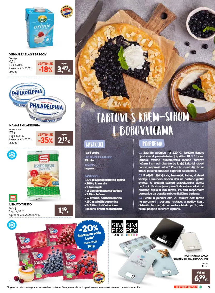 9 vrhnje za šlag ‘z bregov vindija 0,5 l 1 l = 6,98 € cijena na 2. 5. 2025.: 3,99 € namaz philadelphia razne vrste 175 g 1 kg = 12,51 € cijena na 2. 5. 2025.: 3,39 € lisnato tijesto 500 g 1 kg = 2,38 € cijena na 2. 5. 2025.: 1,19 € jeftinije -18 % 4,29 3 , 49 € jeftinije -35 % 3,39 2 , 19 € -20 % smrznuto voće ledo* razne vrste 300 g 1 , 19 € već od: 6 , 99 € kuhinjska vaga simpex ili simpex color razne 1 kom tartovi s krem-sirom i borovnicama | za 4 osobe | ukupno trajanje: 35 min težina: lagano sastojci: • 275 g svježeg lisnatog tijesta • 200 g krem sira • 1 žumanjak • ½ žličice ekstrakta vanilije • 2 žlice šećera • ½ limuna, naribana korica • 150 g svježih borovnica • 2-3 žlice listića badema • šećer u prahu za posipanje 01 zagrijte pećnicu na 220 °c. izrežite lisnato tijesto na 4 pravokutnika (otprilike 10 × 15 cm). rubove svakog pravokutnika lagano zarežite nožem 1 cm od ruba (ne do kraja) kako bi rubovi narasli i napravili „okvir”. položite lisnato tijesto na lim za pečenje obložen papirom za pečenje. 02 u zdjeli miješajte sir, žumanjak, šećer, ekstrakt vanilije i limunovu koricu dok ne nastane glatka smjesa. u sredinu svakog pravokutnika stavite po 1 - 2 žlice nadjeva, pazeći da ostane okvir od praznog dijela u rub tijesta. po siru rasporedite borovnice pa pospite rubove listićima badema. 03 pecite u pećnici oko 20 minuta dok tijesto ne porumeni i postane hrskavo, a nadjev čvrst. ostavite tartove da se malo ohlade pa ih, ako želite, pospite šećerom u prahu. priprema sastojci *cijene na polici umanjene su za navedeni postotak. slika je simbolična. popust se ne odnosi na već snižene i promotivne artikle.