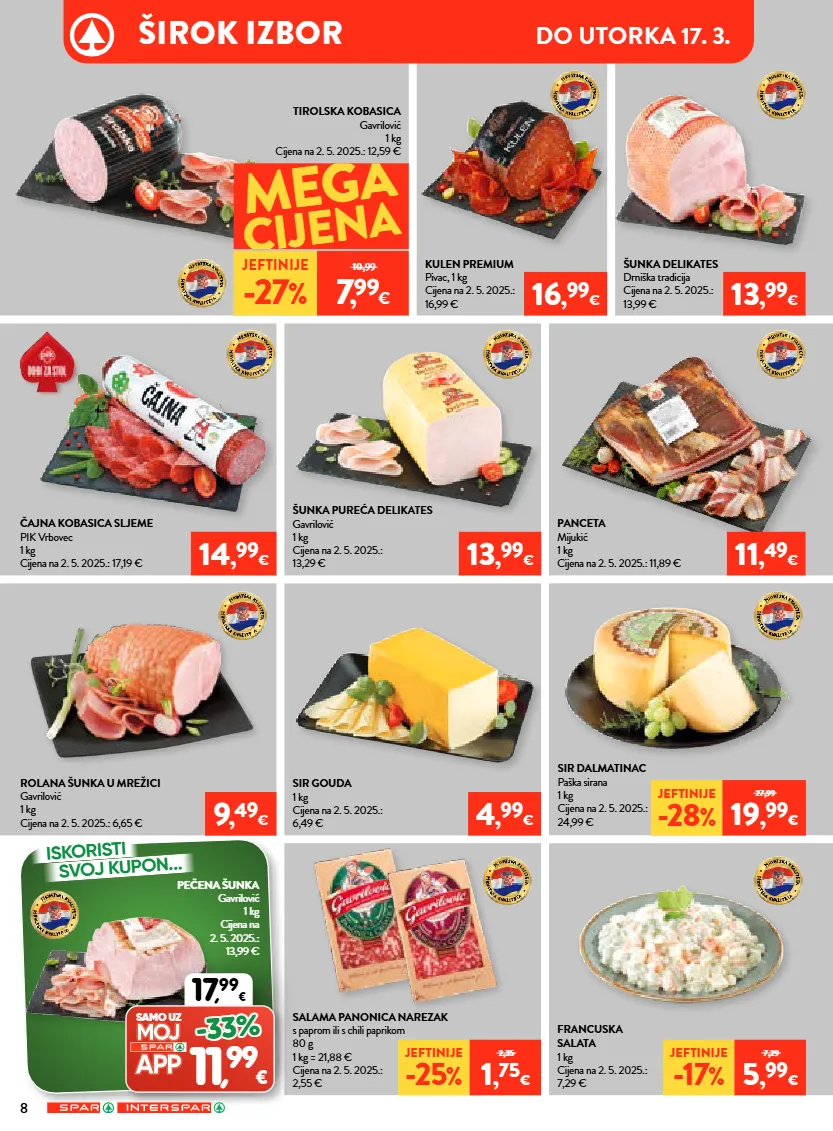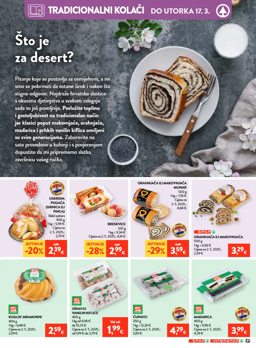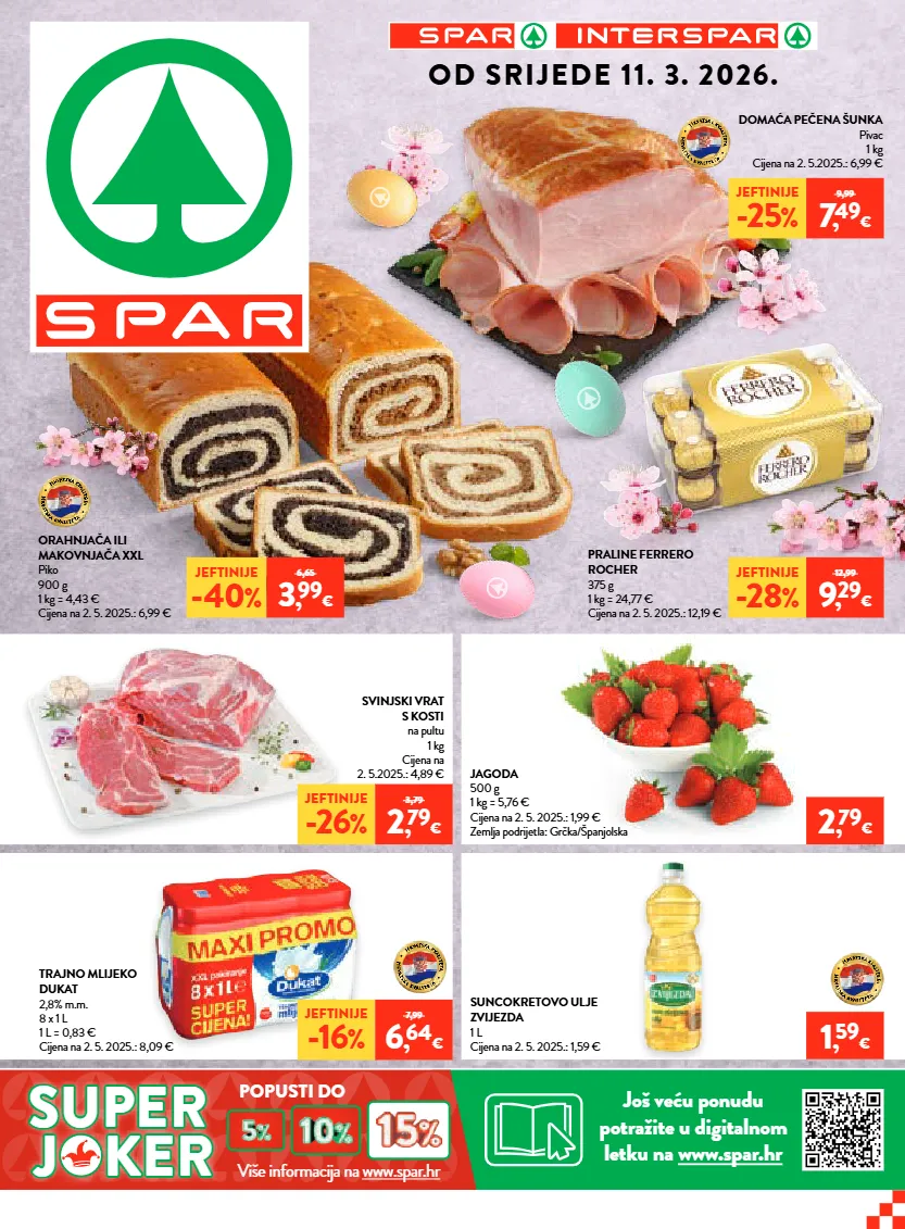 još veću ponudu potražite u digitalnom letku na www.spar.hr super super j ker j ker više informacija na www.spar.hr popusti do svinjski vrat s kosti na pultu 1 kg cijena na 2. 5.2025.: 4,89 € suncokretovo ulje zvijezda 1 l cijena na 2. 5. 2025.: 1,59 € jagoda 500 g 1 kg = 5,76 € cijena na 2. 5. 2025.: 1,99 € zemlja podrijetla: grčka/španjolska praline ferrero rocher 375 g 1 kg = 24,77 € cijena na 2. 5. 2025.: 12,19 € orahnjača ili makovnjača xxl piko 900 g 1 kg = 4,43 € cijena na 2. 5. 2025.: 6,99 € domaća pečena šunka pivac 1 kg cijena na 2. 5.2025.: 6,99 € 1 , 59 € 2 , 79 € jeftinije -26 % 3,79 2 , 79 € jeftinije -28 % 12,99 9 , 29 € jeftinije -25 % 9,99 7 , 49 € jeftinije -40 % 6,65 3 , 99 € trajno mlijeko dukat 2,8% m.m. 8 x 1 l 1 l = 0,83 € cijena na 2. 5. 2025.: 8,09 € jeftinije -16 % 7,99 6 , 64 € od srijede 11. 3. 2026.