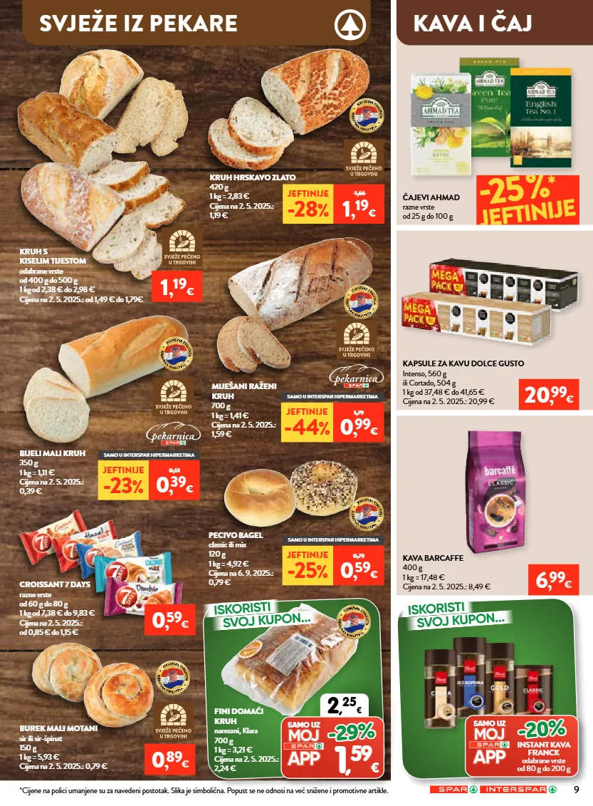 9 *cijene na polici umanjene su za navedeni postotak. slika je simbolična. popust se ne odnosi na već snižene i promotivne artikle. 20 , 99 € 6 , 99 € 0 , 59 € 0 , 89 € 1 , 19 € -25 % * jeftinije jeftinije -28 % 1,66 1 , 19 € iskoristi svoj kupon... iskoristi svoj kupon... 2 , 25 € samo uz 1 , 59 € -29% -29% fini domaći kruh narezani, klara 700 g 1 kg = 3,21 € cijena na 2. 5. 2025.: 2,24 € samo uz -20% -20% instant kava franck odabrane vrste od 80 g do 200 g kapsule za kavu dolce gusto intenso, 560 g ili cortado, 504 g 1 kg od 37,48 € do 41,65 € cijena na 2. 5. 2025.: 20,99 € kruh s kiselim tijestom odabrane vrste od 400 g do 500 g 1 kg od 2,38 € do 2,98 € cijena na 2. 5. 2025.: od 1,49 € do 1,79€ kava barcaffe 400 g 1 kg = 17,48 € cijena na 2. 5. 2025.: 8,49 € kruh hrskavo zlato 420 g 1 kg = 2,83 € cijena na 2. 5. 2025.: 1,19 € miješani raženi kruh 700 g 1 kg = 1,41 € cijena na 2. 5. 2025.: 1,59 € bijeli mali kruh 350 g 1 kg = 1,11 € cijena na 2. 5. 2025.: 0,39 € croissant 7 days razne vrste od 60 g do 80 g 1 kg od 7,38 € do 9,83 € cijena na 2. 5. 2025.: od 0,85 € do 1,15 € pecivo bagel classic ili mix 120 g 1 kg = 4,92 € cijena na 6. 9. 2025.: 0,79 € burek mali motani sir ili sir-špinat 150 g 1 kg = 5,93 € cijena na 2. 5. 2025.: 0,79 € čajevi ahmad razne vrste od 25 g do 100 g kava i čaj samo u interspar hipermarketima jeftinije -44 % 1,79 0 , 99 € samo u interspar hipermarketima jeftinije -25 % 0,79 0 , 59 € samo u interspar hipermarketima jeftinije -23 % 0,51 0 , 39 € svježe iz pekare