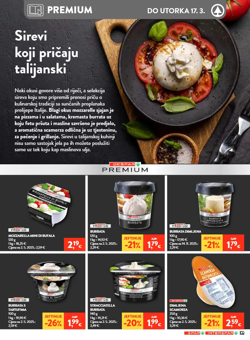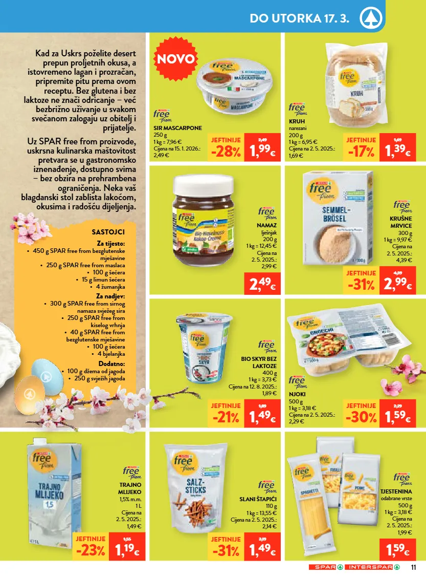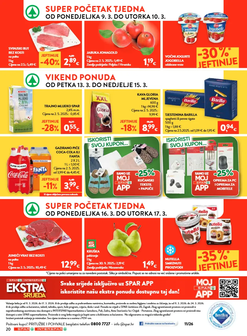važenje letka je od 11. 3. 2026. do 17. 3. 2026. ili do prodaje zaliha za prehrambene namirnice, kozmetiku, proizvode za osobnu higijenu i sredstva za čišćenje, te od 11. 3. 2026. do 24. 3. 2026. ili do prodaje zaliha za kućanstvo, tekstil, tehniku, sport, hobi program, cvijeće, školu i ured. ponuda ne vrijedi u spar jurišićeva 2a, zagreb. zbog ograničenosti prostora svi proizvodi iz neprehrambenog asortimana nisu dostupni u interspar hipermarketima u samoboru, puli, zadru, ante starčevića 5a i osijek - portanova. zbog ograničenosti prostora svi proizvodi nisu dostupni u svim spar supermarketima. proizvode iz ovog letka moguće je kupiti samo u količinama za kućanstvo. ne odgovaramo za moguće tiskarske greške! izraženi postotak sniženja je minimalan. sve cijene izražene su u eurima s pdv-om. poštvani kupci! pritužbe i pohvale besplatni telefon 0800 7727 – info @spar.hr 11/26 *cijene na polici umanjene su za navedeni postotak. slika je simbolična. popust se ne odnosi na već snižene i promotivne artikle. svake srijede isključivo uz spar app iskoristite našu ekstra ponudu dostupnu taj dan! 20 super početak tjedna od ponedjeljka 9. 3. do utorka 10. 3. super početak tjedna od ponedjeljka 16. 3. do utorka 17. 3. vikend ponuda od petka 13. 3. do nedjelje 15. 3. iskoristi svoj kupon... iskoristi svoj kupon... samo uz -25% -25% kućanski tekstil + papuče samo uz -25% -25% oprema za pc i oprema za mobitele nutella smrznuti proizvodi juneći vrat bez kosti na pultu 1 kg cijena na 2. 5. 2025.: 10,49 € kruška pakiranje 1 kg cijena na 30. 9. 2025.: 2,19 € zemlja podrijetla: nizozemska svinjski but bez kosti na pultu 1 kg cijena na 2.5.: 5,49 € voćni jogurti jogobella odabrane vrste tjestenina barilla spaghetti ili penne rigate 500 g 1 kg = 1,88 € cijena na 2.5.2025. od 1,09 € do 1,95 € kava gloria mljevena 600 g 1 kg =14,98 € cijena na 2. 5. 2025.: 9,99 € trajno mlijeko spar 2,8% m.m. cijena na 2. 5. 2025.: 0,85 € gazirano piće coca-cola ili fanta 2 x 2 l 1 l = 1,00 € cijena na 2. 5. 2025. od 3,99 € do 4,45 € -30 % * jeftinije -35 % * jeftinije jabuka jonagold 1 kg cijena na 2. 5. 2025.: 1,49 € zemlja podrijetla: poljska / hrvatska 0 , 94 € 12 , 99 € 1 , 49 € jeftinije -18 % 10,99 8 , 99 € jeftinije -28 % 0,77 0 , 55 € jeftinije -40 % 4,89 2 , 89 € jeftinije -11 % 4,49 3 , 99 € u cijenu uključena povratna naknada 1 , 19 €