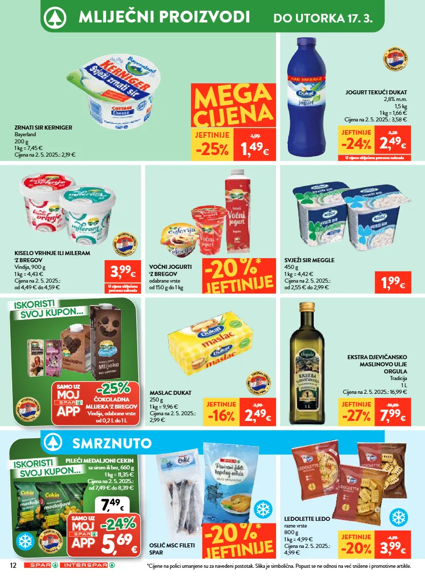 mliječni proizvodi do utorka 17. 3. 12 smrznuto voćni jogurti ‘z bregov odabrane vrste od 150 g do 1 kg jogurt tekući dukat 2,8% m.m. 1,5 kg 1 kg = 1,66 € cijena na 2. 5. 2025.: 3,58 € ekstra djevičansko maslinovo ulje orgula tradicija 1 l cijena na 2. 5. 2025.: 16,99 € maslac dukat 250 g 1 kg = 9,96 € cijena na 2. 5. 2025.: 2,99 € ledolette ledo razne vrste 800 g 1 kg = 4,99 € cijena na 2. 5. 2025.: 4,99 € kiselo vrhnje ili mileram ‘z bregov vindija, 900 g 1 kg = 4,43 € cijena na 2. 5. 2025.: od 4,49 € do 4,59 € svježi sir meggle 450 g 1 kg = 4,42 € cijena na 2. 5. 2025.: od 2,55 € do 2,99 € pileći medaljoni cekin sa sirom ili bez, 660 g 1 kg = 11,35 € cijena na 2. 5. 2025.: od 7,49 € do 8,39 € zrnati sir kerniger bayerland 200 g 1 kg = 7,45 € cijena na 2. 5. 2025.: 2,19 € oslić msc fileti spar jeftinije -20 % 4,99 3 , 99 € u cijenu uključena povratna naknada jeftinije -24 % 3,29 2 , 49 € jeftinije -16 % 2,99 2 , 49 € jeftinije -27 % 10,09 7 , 99 € iskoristi svoj kupon... 1 , 99 € 7 , 49 € samo uz 5 , 69 € -24% -24% -20 % * jeftinije -20 % * jeftinije mega cijena jeftinije -25 % 1,99 1 , 49 € 3 , 99 € u cijenu uključena povratna naknada iskoristi svoj kupon... *cijene na polici umanjene su za navedeni postotak. slika je simbolična. popust se ne odnosi na već snižene i promotivne artikle. samo uz -25% -25% čokoladna mlijeka ‘z bregov vindija, odabrane vrste od 0,2 l do 1 l