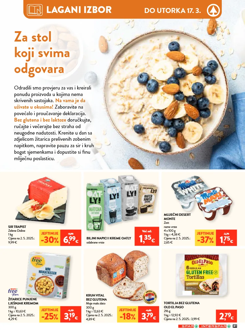 za stol koji svima odgovara odradili smo provjeru za vas i kreirali ponudu proizvoda u kojima nema skrivenih sastojaka. na vama je da uživate u okusima! zaboravite na povećalo i proučavanje deklaracija. bez glutena i bez laktoze doručkujte, ručajte i večerajte bez straha od neugodne nadutosti. krenite u dan sa zdjelicom žitarica prelivenih zobenim napitkom, napravite pauzu za sir i kruh bogat sjemenkama i dopustite si finu mliječnu poslasticu. do utorka 17. 3. lagani izbor sir trapist zelene doline 1 kg cijena na 2. 5. 2025.: 9,99 € biljni napici i kreme oatly odabrane vrste mliječni desert monte zott razne vrste 4 x 100 g 1 kg = 4,38 € cijena na 2. 5. 2025.: 2,65 € tortilja bez glutena old el paso 216 g 1 kg = 12,92 € cijena na 2. 5. 2025.: 3,99 € jeftinije -18 % 4,65 3 , 79 € jeftinije -30 % 9,99 6 , 99 € jeftinije -25 % 4,29 3 , 19 € jeftinije -37 % 2,79 1 , 75 € žitarice punjene lješnjak kremom 300 g 1 kg = 10,63 € cijena na 2. 5. 2025.: 4,29 € kruh vital bez glutena moje malo zlato 300 g 1 kg = 12,63 € cijena na 2. 5. 2025.: 4,89 € već od: 1 , 35 € 2 , 79 €