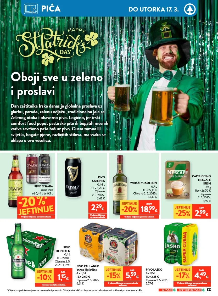 *cijene na polici umanjene su za navedeni postotak. slika je simbolična. popust se ne odnosi na već snižene i promotivne artikle. do utorka 17. 3. pića pivo guinnes 0,44 l 1 l = 5,20 € cijena na 2. 5. 2025.: 2,62 € pivo o´hara razne vrste od 0,44 l do 0,5 l pivo heineken 0,4 l 1 l = 2,88 € cijena na 2. 5. 2025.: 1,29 € pivo laško 4 x 0,5 l 1 l = 2,25 € cijena na 2. 5. 2025.: 5,27 € pivo paulaner original ili pšenično 4 x 0,5 l 1 l = 2,60 € cijena na 2. 5. 2025.: 6,61 € whiskey jameson 0,7 l 1 l = 27,13 € cijena na 2. 5. 2025.: 23,32 € cappuccino nescafé irish 112 g 1 kg = 26,70 € cijena na 2. 5. 2025.: 3,99 € jeftinije -25 % 3,99 2 , 99 € oboji sve u zeleno i proslavi dan zaštitnika irske danas je globalna proslava uz glazbu, parade, zelenu odjeću, tradicionalna jela sa zelenog otoka i obavezno pivo. logično, jer irski comfort food poput pastirske pite ili bogatih mesnih variva savršeno paše baš uz pivo. gusta tamna ili svijetla, bogate pjene, različitih stilova, ma svako se uklapa u ovu veselicu. jeftinije -15 % 6,61 5 , 59 € u cijenu uključena povratna naknada po limenci u cijenu uključena povratna naknada po limenci jeftinije -17 % 5,45 4 , 49 € jeftinije -20 % 23,99 18 , 99 € u cijenu uključena povratna naknada jeftinije -10 % 1,29 1 , 15 € povratna kaucijska ambalaža. -20 % * jeftinije u cijenu uključena povratna naknada 2 , 29 € u cijenu uključena povratna naknada