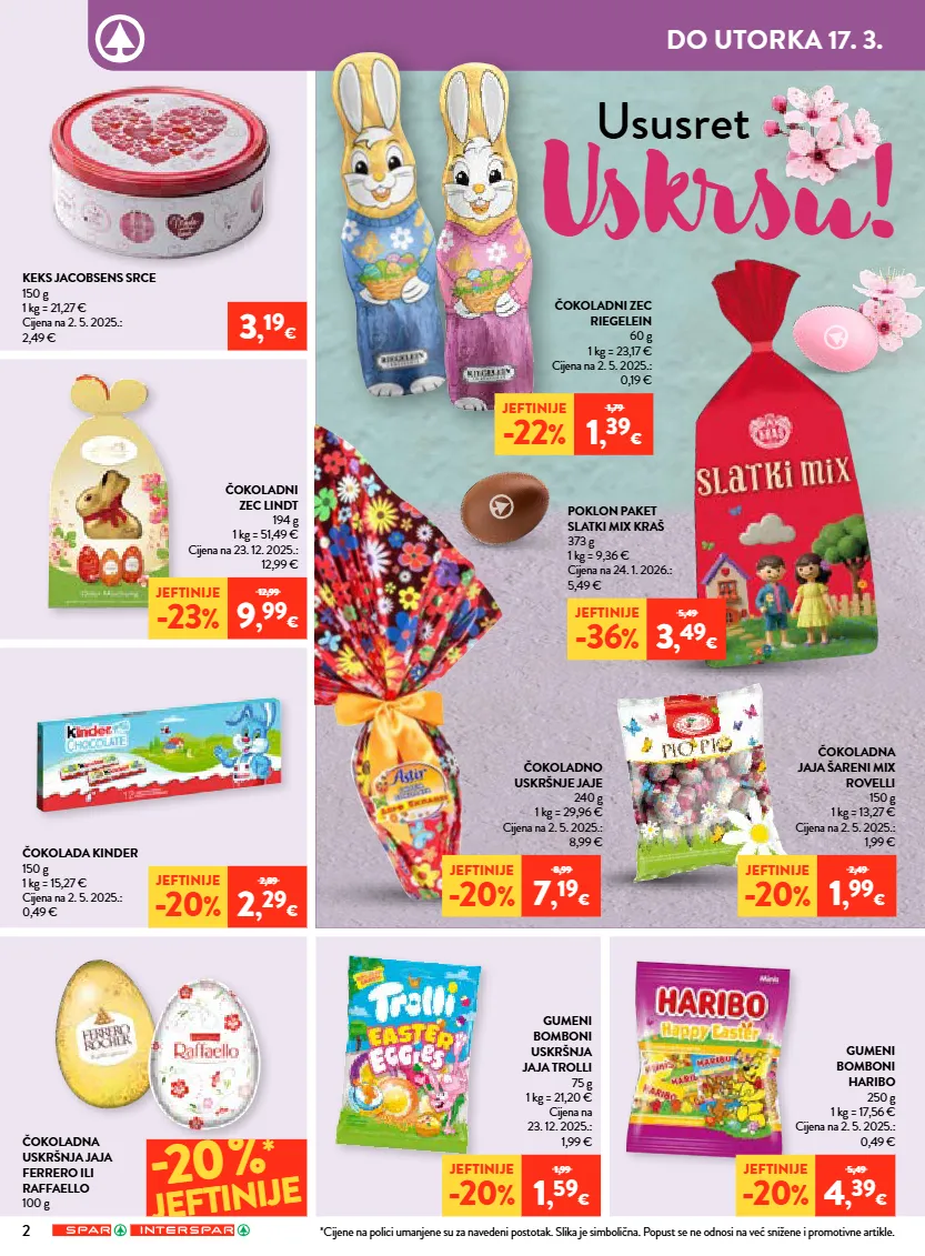 ususret 2 čokoladni zec lindt 194 g 1 kg = 51,49 € cijena na 23. 12. 2025.: 12,99 € jeftinije -20 % 2,89 2 , 29 € keks jacobsens srce 150 g 1 kg = 21,27 € cijena na 2. 5. 2025.: 2,49 € čokolada kinder 150 g 1 kg = 15,27 € cijena na 2. 5. 2025.: 0,49 € čokoladna uskršnja jaja ferrero ili raffaello 100 g gumeni bomboni uskršnja jaja trolli 75 g 1 kg = 21,20 € cijena na 23. 12. 2025.: 1,99 € čokoladna jaja šareni mix rovelli 150 g 1 kg = 13,27 € cijena na 2. 5. 2025.: 1,99 € čokoladno uskršnje jaje 240 g 1 kg = 29,96 € cijena na 2. 5. 2025.: 8,99 € poklon paket slatki mix kraš 373 g 1 kg = 9,36 € cijena na 24. 1. 2026.: 5,49 € gumeni bomboni haribo 250 g 1 kg = 17,56 € cijena na 2. 5. 2025.: 0,49 € -20 % * jeftinije jeftinije -23 % 12,99 9 , 99 € jeftinije -20 % 5,49 4 , 39 € jeftinije -20 % 1,99 1 , 59 € jeftinije -20 % 2,49 1 , 99 € jeftinije -20 % 8,99 7 , 19 € jeftinije -36 % 5,49 3 , 49 € 3 , 19 € *cijene na polici umanjene su za navedeni postotak. slika je simbolična. popust se ne odnosi na već snižene i promotivne artikle. uskrsu! čokoladni zec riegelein 60 g 1 kg = 23,17 € cijena na 2. 5. 2025.: 0,19 € jeftinije -22 % 1,79 1 , 39 € do utorka 17. 3.