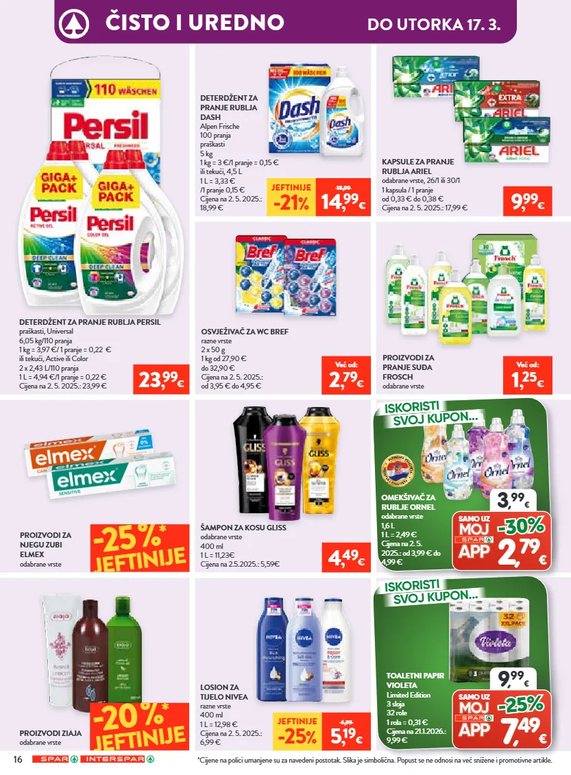 čisto i uredno do utorka 17. 3. 16 proizvodi ziaja odabrane vrste losion za tijelo nivea razne vrste 400 ml 1 l = 12,98 € cijena na 2. 5. 2025.: 6,99 € proizvodi za njegu zubi elmex odabrane vrste proizvodi za pranje suđa frosch odabrane vrste deterdžent za pranje rublja dash alpen frische 100 pranja praškasti 5 kg 1 kg = 3 €/1 pranje = 0,15 € ili tekući, 4,5 l 1 l = 3,33 € /1 pranje 0,15 € cijena na 2. 5. 2025.: 18,99 € omekšivač za rublje ornel odabrane vrste 1,6 l 1 l = 2,49 € cijena na 2. 5. 2025.: od 3,99 € do 4,99 € toaletni papir violeta limited edition 3 sloja 32 role 1 rola = 0,31 € cijena na 21.1.2026.: 9,99 € šampon za kosu gliss odabrane vrste 400 ml 1 l = 11,23€ cijena na 2.5.2025.: 5,59€ kapsule za pranje rublja ariel odabrane vrste, 26/1 ili 30/1 1 kapsula / 1 pranje od 0,33 € do 0,38 € cijena na 2. 5. 2025.: 17,99 € osvježivač za wc bref razne vrste 2 x 50 g 1 kg od 27,90 € do 32,90 € cijena na 2. 5. 2025.: od 3,95 € do 4,95 € deterdžent za pranje rublja persil praškasti, universal 6,05 kg/110 pranja 1 kg = 3,97 €/ 1 pranje = 0,22 € ili tekući, active ili color 2 x 2,43 l/110 pranja 1 l = 4,94 €/1 pranje = 0,22 € cijena na 2. 5. 2025.: 23,99 € jeftinije -21 % 18,99 14 , 99 € jeftinije -25 % 6,99 5 , 19 € -25 % * jeftinije -20 % * jeftinije već od: 2 , 79 € već od: 1 , 25 € iskoristi svoj kupon... 9 , 99 € samo uz 7 , 49 € -25% -25% iskoristi svoj kupon... 3 , 99 € samo uz 2 , 79 € -30% -30% 23 , 99 € 9 , 99 € 4 , 49 € *cijene na polici umanjene su za navedeni postotak. slika je simbolična. popust se ne odnosi na već snižene i promotivne artikle.
