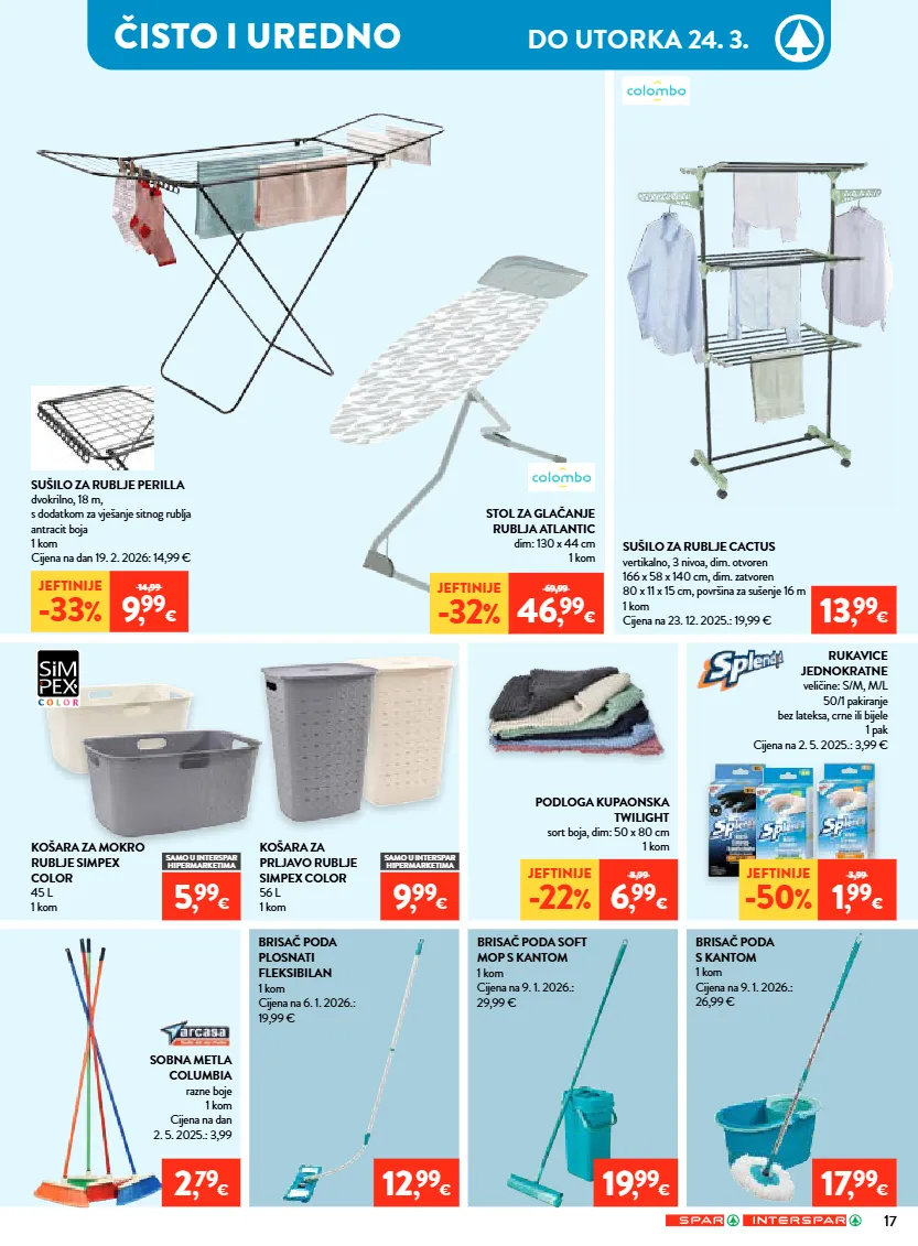 17 čisto i uredno do utorka 24. 3. brisač poda s kantom 1 kom cijena na 9. 1. 2026.: 26,99 € brisač poda plosnati fleksibilan 1 kom cijena na 6. 1. 2026.: 19,99 € sušilo za rublje cactus vertikalno, 3 nivoa, dim. otvoren 166 x 58 x 140 cm, dim. zatvoren 80 x 11 x 15 cm, površina za sušenje 16 m 1 kom cijena na 23. 12. 2025.: 19,99 € sobna metla columbia razne boje 1 kom cijena na dan 2. 5. 2025.: 3,99 sušilo za rublje perilla dvokrilno, 18 m, s dodatkom za vješanje sitnog rublja antracit boja 1 kom cijena na dan 19. 2. 2026: 14,99 € košara za prljavo rublje simpex color 56 l 1 kom rukavice jednokratne veličine: s/m, m/l 50/1 pakiranje bez lateksa, crne ili bijele 1 pak cijena na 2. 5. 2025.: 3,99 € brisač poda soft mop s kantom 1 kom cijena na 9. 1. 2026.: 29,99 € stol za glačanje rublja atlantic dim: 130 x 44 cm 1 kom podloga kupaonska twilight sort boja, dim: 50 x 80 cm 1 kom košara za mokro rublje simpex color 45 l 1 kom jeftinije -50 % 3,99 1 , 99 € jeftinije -22 % 8,99 6 , 99 € jeftinije -33 % 14,99 9 , 99 € jeftinije -32 % 69,99 46 , 99 € samo u interspar hipermarketima samo u interspar hipermarketima 9 , 99 € 13 , 99 € 12 , 99 € 17 , 99 € 19 , 99 € 5 , 99 € 2 , 79 €