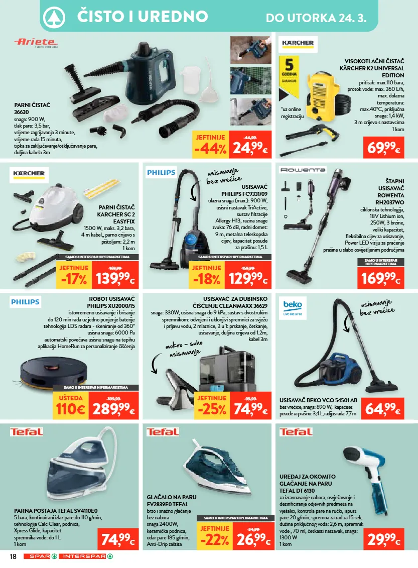 čisto i uredno do utorka 24. 3. 18 samo u interspar hipermarketima usisavač beko vco 54501 ab bez vrećice, snaga: 890 w, kapacitet posude za prašinu: 3,4 l, radijus rada: 7,7 m robot usisavač philips xu2000/15 istovremeno usisavanje i brisanje do 120 min rada uz jedno punjenje baterije tehnologija lds radara - skeniranje od 360° usisna snaga: 6000 pa automatski povećava usisnu snagu na tepihu aplikacija homerun za personaliziranje čišćenja glačalo na paru fv2839e0 tefal brzo i snažno glačanje bez nabora snaga 2400w, keramička podnica, udar pare 185 g/min, anti-drip zaštita uređaj za okomito glačanje na paru tefal dt 6130 za izravnavanje nabora, osvježavanje i dezinficiranje odjevnih predmeta na vješalici, kontrola pare na ručki, ispust pare 20 g/min, spremna za rad za 15 sek, dužina priključnog voda: 2,6 m, spremnik vode , 70 ml, četkasti nastavak, snaga: 1300 w 1 kom parni čistač karcher sc 2 easyfix 1500 w, maks. 3,2 bara, 4 m kabel,, parno crijevo s pištoljem: 2,2 m 1 kom štapni usisavač rowenta rh2037wo ciklonska tehnologija, 18v lithium ion, 250w, 3 brzine, veliki kapacitet, fleksibilna cijev za usisavanje, power led viziju za praćenje prašine u slabo osvijetljenim područjima usisavač za dubinsko čišćenje cleanmaxx 36629 snaga: 330w, usisna snaga do 9 kpa, sustav s dvostrukim spremnikom: odvojeni i uklonjivi spremnici za svježu i prljavu vodu, 2 mlaznice, 3 u 1: prskanje, četkanje, usisavanje, duljina crijeva od 1.2m, kabel 3m visokotlačni čistač kärcher k2 universal edition pritisak: max.110 bara, protok vode: max. 360 l/h, max. dolazna temperatura: max.40°c, priključna snaga: 1,4 kw, 3 m crijevo s nastavcima 1 kom *uz online registraciju parna postaja tefal sv4110e0 5 bara, kontinuirani izlaz pare do 110 g/min, tehnologija calc clear, podnica, xpress glide, kapacitet spremnika vode: do 1 l 1 kom parni čistač 36630 snaga: 900 w, tlak pare: 3,5 bar, vrijeme zagrijavanja 3 minute, vrijeme rada 15 minuta, tipka za zaključavanje/otključavanje pare, duljina kabela 3m usisavač philips fc9331/09 ulazna snaga (max.): 900 w, usisni nastavak triactive, sustav filtracije allergy h13, razina snage zvuka: 76 db, radni domet: 9 m, metalna teleskopska cijev, kapacitet posude za prašinu: 1,5 l jeftinije -17 % 169,99 139 , 99 € ušteda 110 € 399,99 289 , 99 € jeftinije -44 % 44,99 24 , 99 € jeftinije -18 % 159,99 129 , 99 € jeftinije -25 % 99,99 74 , 99 € jeftinije -22 % 34,99 26 , 99 € samo u interspar hipermarketima usisavanje bez vrećice usisavanje bez vrećice mokro - suho usisavanje samo u interspar hipermarketima samo u interspar hipermarketima samo u interspar hipermarketima 69 , 99 € 29 , 99 € 169 , 99 € 64 , 99 € 74 , 99 €