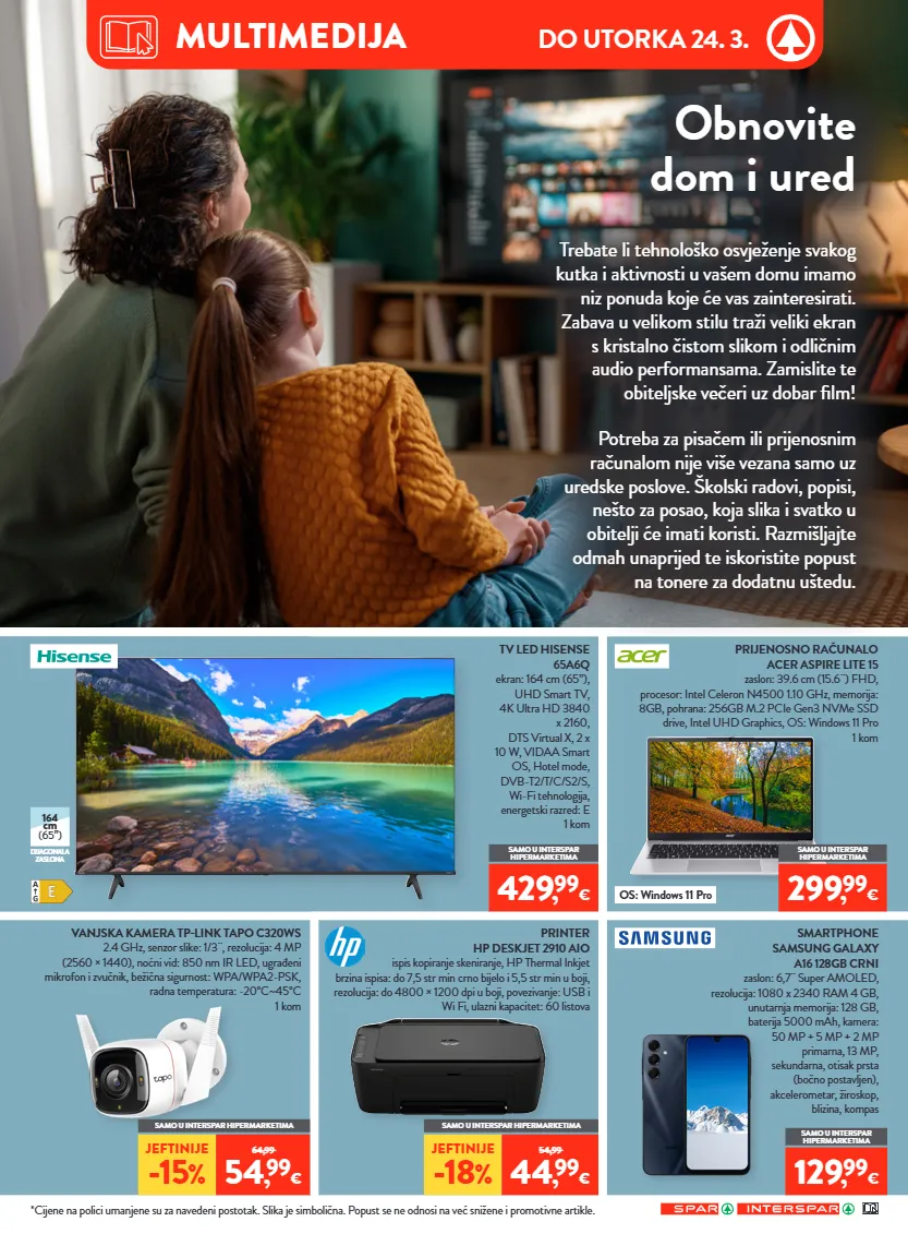 *cijene na polici umanjene su za navedeni postotak. slika je simbolična. popust se ne odnosi na već snižene i promotivne artikle. jeftinije -15 % 64,99 54 , 99 € jeftinije -18 % 54,99 44 , 99 € tv led hisense 65a6q ekran: 164 cm (65”), uhd smart tv, 4k ultra hd 3840 x 2160, dts virtual x, 2 x 10 w, vidaa smart os, hotel mode, dvb-t2/t/c/s2/s, wi-fi tehnologija, energetski razred: e 1 kom smartphone samsung galaxy a16 128gb crni zaslon: 6,7¨ super amoled, rezolucija: 1080 x 2340 ram 4 gb, unutarnja memorija: 128 gb, baterija 5000 mah, kamera: 50 mp + 5 mp + 2 mp primarna, 13 mp, sekundarna, otisak prsta (bočno postavljen), akcelerometar, žiroskop, blizina, kompas os: windows 11 pro prijenosno računalo acer aspire lite 15 zaslon: 39.6 cm (15.6¨) fhd, procesor: intel celeron n4500 1.10 ghz, memorija: 8gb, pohrana: 256gb m.2 pcie gen3 nvme ssd drive, intel uhd graphics, os: windows 11 pro 1 kom vanjska kamera tp-link tapo c320ws 2.4 ghz, senzor slike: 1/3¨, rezolucija: 4 mp (2560 × 1440), noćni vid: 850 nm ir led, ugrađeni mikrofon i zvučnik, bežična sigurnost: wpa/wpa2-psk, radna temperatura: -20°c~45°c 1 kom printer hp deskjet 2910 aio ispis kopiranje skeniranje, hp thermal inkjet brzina ispisa: do 7,5 str min crno bijelo i 5,5 str min u boji, rezolucija: do 4800 × 1200 dpi u boji, povezivanje: usb i wi fi, ulazni kapacitet: 60 listova trebate li tehnološko osvježenje svakog kutka i aktivnosti u vašem domu imamo niz ponuda koje će vas zainteresirati. zabava u velikom stilu traži veliki ekran s kristalno čistom slikom i odličnim audio performansama. zamislite te obiteljske večeri uz dobar film! potreba za pisačem ili prijenosnim računalom nije više vezana samo uz uredske poslove. školski radovi, popisi, nešto za posao, koja slika i svatko u obitelji će imati koristi. razmišljajte odmah unaprijed te iskoristite popust na tonere za dodatnu uštedu. obnovite dom i ured 429 , 99 € 129 , 99 € 299 , 99 € 164 cm (65”) dijagonala zaslona samo u interspar hipermarketima samo u interspar hipermarketima samo u interspar hipermarketima samo u interspar hipermarketima samo u interspar hipermarketima do utorka 24. 3. multimedija