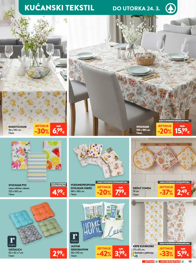 19 kućanski tekstil do utorka 24. 3. stolnjak pvc razne veličine i dezeni 120 x 160 cm 1 kom sjedalica 42 x 42 x 7 cm 1 kom jastuk dekorativni 40 x 40 cm 1 kom stolnjak 140 x 180 cm 1 kom krpe kuhinjske 50 x 65 cm, 2 komada u pakiranju 1 pak držač tonda 19 cm 1 kom nadstolnjak 46 x 140 cm 1 kom vodonepropusni stolnjak uskrs 140 x 180 cm 1 kom jeftinije -42 % 6,99 3 , 99 € jeftinije -33 % 8,99 5 , 99 € jeftinije -30 % 8,99 6 , 99 € jeftinije -37 % 3,99 2 , 49 € jeftinije -20 % 9,99 7 , 99 € jeftinije -20 % 19,99 15 , 99 € samo u interspar hipermarketima samo u interspar hipermarketima samo u interspar hipermarketima samo u interspar hipermarketima samo u interspar hipermarketima 4 , 99 € 2 , 99 €