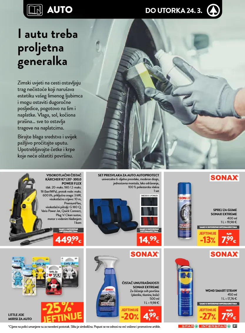 do utorka 24. 3. auto jeftinije -20 % 6,29 4 , 99 € visokotlačni čistač kärcher k7 1.317- 300.0 power flex tlak: 20-maks. 180 / 2-maks. 18 (bar/mpa), protok vode: maks. 600 l/h, priključna snaga: 3 kw, visokotlačno crijevo: 10 m, premiumflex, visokotlačni pištolji: g 180 q, vario power jet, quick connect, plug ‘n’ clean sustav, motor s vodenim hlađenjem 1 kom čistač unutrašnjosti sonax extreme za čišćenje svih površina (plastika, tkanina, koža) 500 ml 1 l = 9,98 € wd40 smart straw 450 ml 1 l = 17,76 € little joe mirisi za auto set presvlaka za auto autoprotect univerzalne 6-dijelne presvlake, moderan dizajn, jednostavna montaža, lako održavanje, 100 % poliesterska vlakna 1 set sprej za gume sonax extreme 400 ml 1 l = 19,98 € također u ponudi i autu treba proljetna generalka zimski uvjeti na cesti ostavljaju trag nečistoće koji narušava estetiku vašeg limenog ljubimca i mogu ostaviti dugoročne posljedice, pogotovo na lim i naplatke. vlaga, sol, kočiona prašina… sve to ostavlja tragove na naplatcima. birajte blaga sredstva i uvijek pažljivo pročitajte uputu. upotrebljavajte četke i krpe koje neće oštetiti površinu. *cijene na polici umanjene su za navedeni postotak. slika je simbolična. popust se ne odnosi na već snižene i promotivne artikle. 449 , 99 € samo u interspar hipermarketima 14 , 99 € samo u interspar hipermarketima jeftinije -27 % 10,99 7 , 99 € samo u interspar hipermarketima jeftinije -13 % 9,29 7 , 99 € samo u interspar hipermarketima -25 % * jeftinije