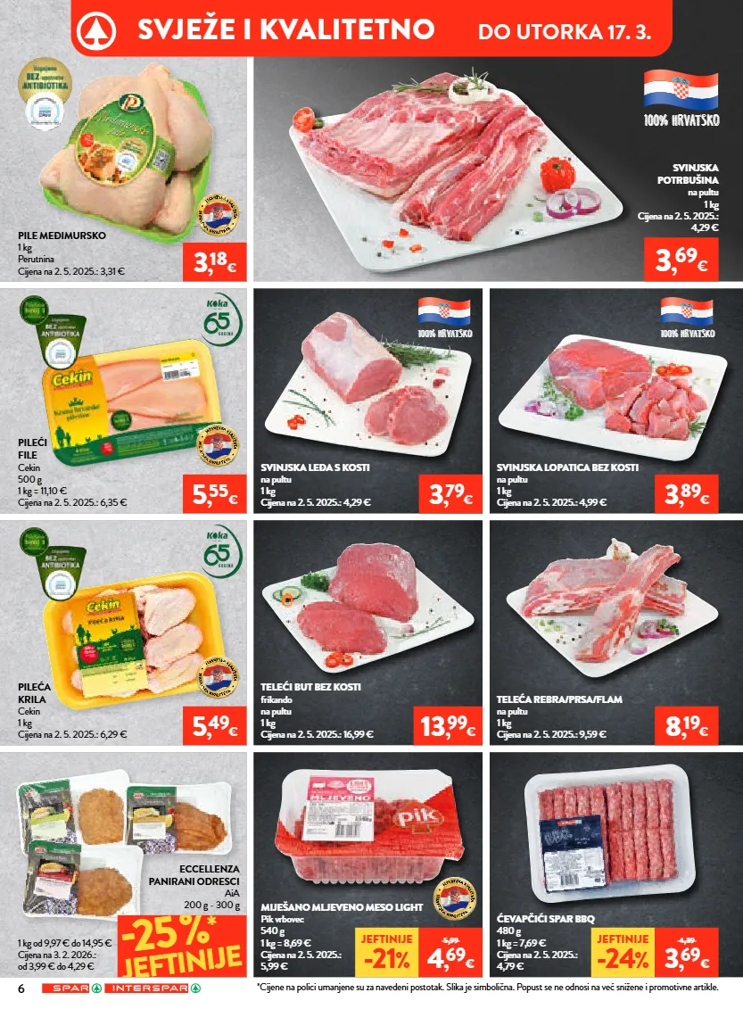 *cijene na polici umanjene su za navedeni postotak. slika je simbolična. popust se ne odnosi na već snižene i promotivne artikle. teleći but bez kosti frikando na pultu 1 kg cijena na 2. 5. 2025.: 16,99 € 13 , 99 € teleća rebra/prsa/flam na pultu 1 kg cijena na 2. 5. 2025.: 9,59 € 8 , 19 € svinjska lopatica bez kosti na pultu 1 kg cijena na 2. 5. 2025.: 4,99 € 3 , 89 € svinjska leđa s kosti na pultu 1 kg cijena na 2. 5. 2025.: 4,29 € 3 , 79 € pileći file cekin 500 g 1 kg = 11,10 € cijena na 2. 5. 2025.: 6,35 € 5 , 55 € pile međimursko 1 kg perutnina cijena na 2. 5. 2025.: 3,31 € 3 , 18 € svinjska potrbušina na pultu 1 kg cijena na 2. 5. 2025.: 4,29 € pileća krila cekin 1 kg cijena na 2. 5. 2025.: 6,29 € 5 , 49 € miješano mljeveno meso light pik vrbovec 540 g 1 kg = 8,69 € cijena na 2. 5. 2025.: 5,99 € ćevapčići spar bbq 480 g 1 kg = 7,69 € cijena na 2. 5. 2025.: 4,79 € 1 kg od 9,97 € do 14,95 € cijena na 3. 2. 2026.: od 3,99 € do 4,29 € 100% hrvatsko 100% hrvatsko 100% hrvatsko -25 % * jeftinije 3 , 69 € jeftinije -21 % 5,99 4 , 69 € jeftinije -24 % 4,89 3 , 69 € eccellenza panirani odresci aia 200 g - 300 g do utorka 17. 3. svježe i kvalitetno 6