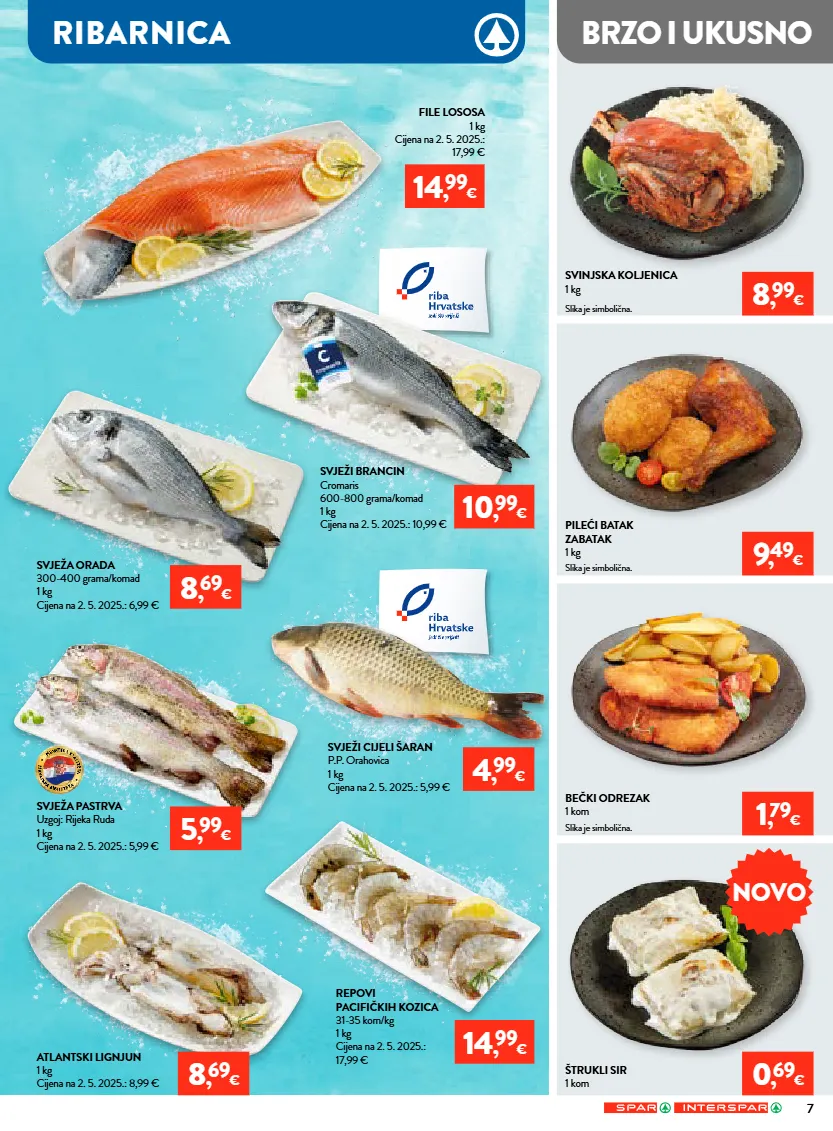 14 , 99 € ribarnica 5 , 99 € 8 , 99 € 9 , 49 € 1 , 79 € 0 , 69 € svinjska koljenica 1 kg pileći batak zabatak 1 kg bečki odrezak 1 kom štrukli sir 1 kom slika je simbolična. slika je simbolična. slika je simbolična. novo svježi brancin cromaris 600-800 grama/komad 1 kg cijena na 2. 5. 2025.: 10,99 € svježi cijeli šaran p.p. orahovica 1 kg cijena na 2. 5. 2025.: 5,99 € repovi pacifičkih kozica 31-35 kom/kg 1 kg cijena na 2. 5. 2025.: 17,99 € file lososa 1 kg cijena na 2. 5. 2025.: 17,99 € svježa orada 300-400 grama/komad 1 kg cijena na 2. 5. 2025.: 6,99 € svježa pastrva uzgoj: rijeka ruda 1 kg cijena na 2. 5. 2025.: 5,99 € atlantski lignjun 1 kg cijena na 2. 5. 2025.: 8,99 € 8 , 69 € 10 , 99 € 4 , 99 € 8 , 69 € 14 , 99 € brzo i ukusno 7