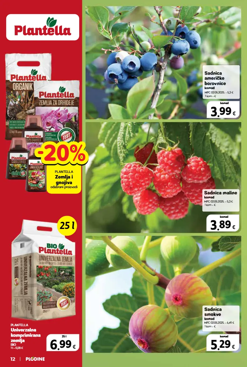 -20% -20% plantella zemlja i gnojiva odabrani proizvodi 6 6 . . 99 99 € 25 l 5 5 . . 29 29 € komad 3 3 . . 89 89 € komad 3 3 . . 99 99 € komad plantella univerzalna komprimirana zemlja bio 1 l = 0,28 € sadnica smokve komad mpc 02.05.2025. = 6,49 € 1 kom = € sadnica maline komad mpc 02.05.2025. = 5,3 € 1 kom = € sadnica američke borovnice komad mpc 02.05.2025. = 5,3 € 1 kom = € 25 l 12