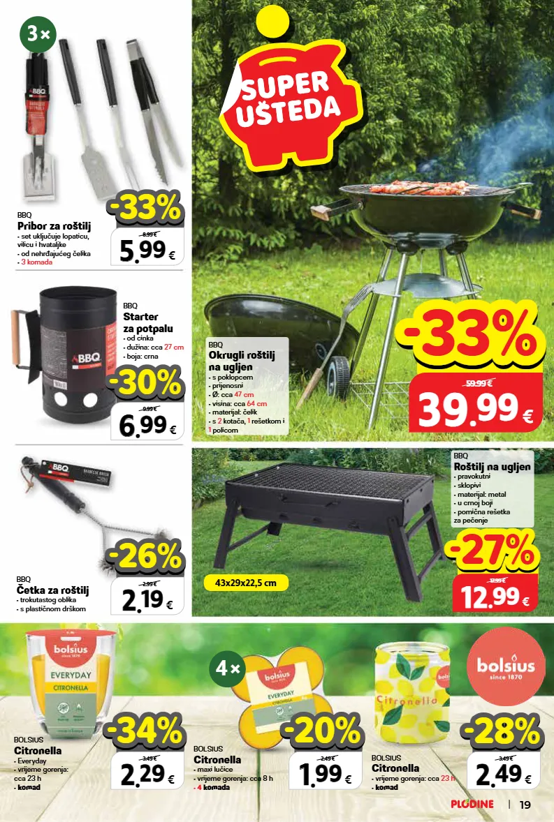 bbq okrugli roštilj na ugljen • s poklopcem • prijenosni • ø: cca 47 cm • visina: cca 64 cm • materijal: čelik • s 2 kotača, 1 rešetkom i 1 policom bbq roštilj na ugljen • pravokutni • sklopivi • materijal: metal • u crnoj boji • pomična rešetka za pečenje bolsius citronella • everyday • vrijeme gorenja: cca 23 h • komad bbq pribor za roštilj • set uključuje lopaticu, vilicu i hvataljke • od nehrđajućeg čelika • 3 komada bbq četka za roštilj • trokutastog oblika • s plastičnom drškom bolsius citronella • maxi lučice • vrijeme gorenja: cca 8 h • 4 komada bbq starter za potpalu • od cinka • dužina: cca 27 cm • boja: crna bolsius citronella • vrijeme gorenja: cca 23 h • komad 2 2 . . 29 29 € komad 3.49 € -34% -34% 1 1 . . 99 99 € 4 komada 2.49 € -20% -20% 2 2 . . 49 49 € komad 3.49 € -28% -28% 5 5 . . 99 99 € 3 komada 8.99 € -33% -33% 6 6 . . 99 99 € 9.99 € -30% -30% 2 2 . . 19 19 € 2.99 € -26% -26% top cijena! već od hit cijena! super prilika! 39 39 . . 99 99 € samo u plodinama 59.99 € -33% -33% top cijena! već od hit cijena! super prilika! 12 12 . . 99 99 € samo u plodinama 17.99 € -27% -27% 3 × 4 × 43x29x22,5 cm 19