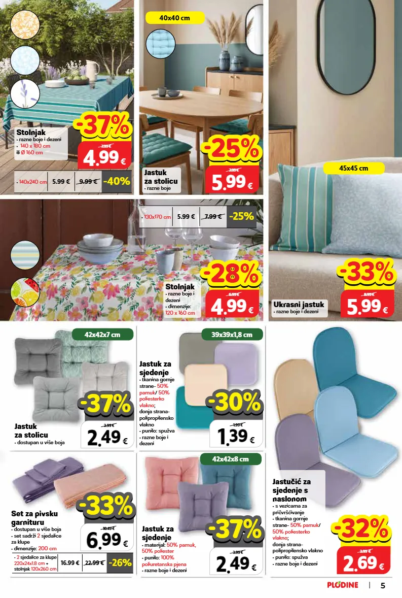 jastuk za stolicu • dostupan u više boja jastuk za sjedenje • tkanina gornje strane- 50% pamuk/ 50% poliesterko vlakno; donja strana- polipropilensko vlakno • punilo: spužva • razne boje i dezeni ukrasni jastuk • razne boje i dezeni jastučić za sjedenje s naslonom • s vezicama za pričvršćivanje • tkanina gornje strane- 50% pamuk/ 50% poliesterko vlakno; donja strana- polipropilensko vlakno • punilo: spužva • razne boje i dezeni set za pivsku garnituru • dostupan u više boja • set sadrži 2 sjedalice za klupe • dimenzije: 200 cm jastuk za stolicu • razne boje jastuk za sjedenje • materijal: 50% pamuk, 50% poliester • punilo: 100% poliuretanska pjena • razne boje i dezeni stolnjak • razne boje i dezeni • dimenzije: 120 x 160 cm stolnjak • razne boje i dezeni • 140 x 180 cm ili ø 160 cm • 2 sjedalice za klupe 220x24x1.8 cm + stolnjak 120x260 cm -26% 16.99 € 22.99 € 2 2 . . 49 49 € 3.99 € -37% -37% 1 1 . . 39 39 € 1.99 € -30% -30% 2 2 . . 49 49 € 3.99 € -37% -37% 6 6 . . 99 99 € 10.49 € -33% -33% top cijena! već od hit cijena! super prilika! 5 5 . . 99 99 € samo u plodinama 8.99 € -33% -33% top cijena! već od hit cijena! super prilika! 5 5 . . 99 99 € samo u plodinama 7.99 € -25% -25% top cijena! već od hit cijena! super prilika! 4 4 . . 99 99 € samo u plodinama 7.99 € -37% -37% top cijena! već od hit cijena! super prilika! 2 2 . . 69 69 € xxxxx samo u plodinama 3.99 € -32% -32% • 140x240 cm -40% 5.99 € 9.99 € • 130x170 cm -25% 5.99 € 7.99 € top cijena! već od hit cijena! super prilika! 4 4 . . 99 99 € samo u plodinama 6.99 € -28% -28% 40x40 cm 45x45 cm 39x39x1,8 cm 42x42x7 cm 42x42x8 cm 5