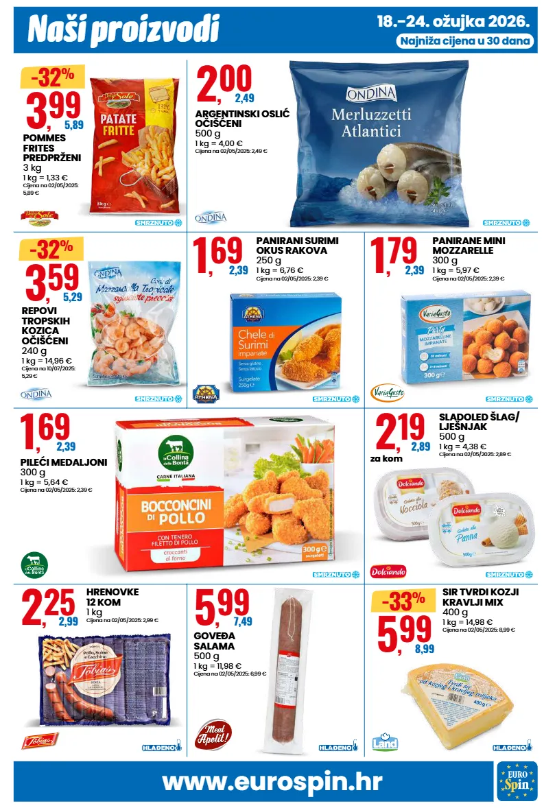 www.eurospin.hr naši proizvodi 18.-24. ožujka 2026. najniža cijena u 30 dana 3 , 99 5,89 -32 % pommes frites predprženi 3 kg 1 kg = 1,33 € cijena na 02/05/2025: 5,89 € 2 , 00 2,49 argentinski oslić očišćeni 500 g 1 kg = 4,00 € cijena na 02/05/2025: 2,49 € 3 , 59 5,29 -32 % repovi tropskih kozica očišćeni 240 g 1 kg = 14,96 € cijena na 10/07/2025: 5,29 € 1 , 69 2,39 panirani surimi okus rakova 250 g 1 kg = 6,76 € cijena na 02/05/2025: 2,39 € 1 , 69 2,39 pileći medaljoni 300 g 1 kg = 5,64 € cijena na 02/05/2025: 2,39 € 1 , 79 2,39 panirane mini mozzarelle 300 g 1 kg = 5,97 € cijena na 02/05/2025: 2,39 € 2 , 19 2,89 za kom sladoled šlag/ lješnjak 500 g 1 kg = 4,38 € cijena na 02/05/2025: 2,89 € 2 , 25 2,99 hrenovke 12 kom 1 kg cijena na 02/05/2025: 2,99 € 5 , 99 7,49 goveða salama 500 g 1 kg = 11,98 € cijena na 02/05/2025: 6,99 € 5 , 99 8,99 -33 % sir tvrdi kozji kravlji mix 400 g 1 kg = 14,98 € cijena na 02/05/2025: 8,99 €