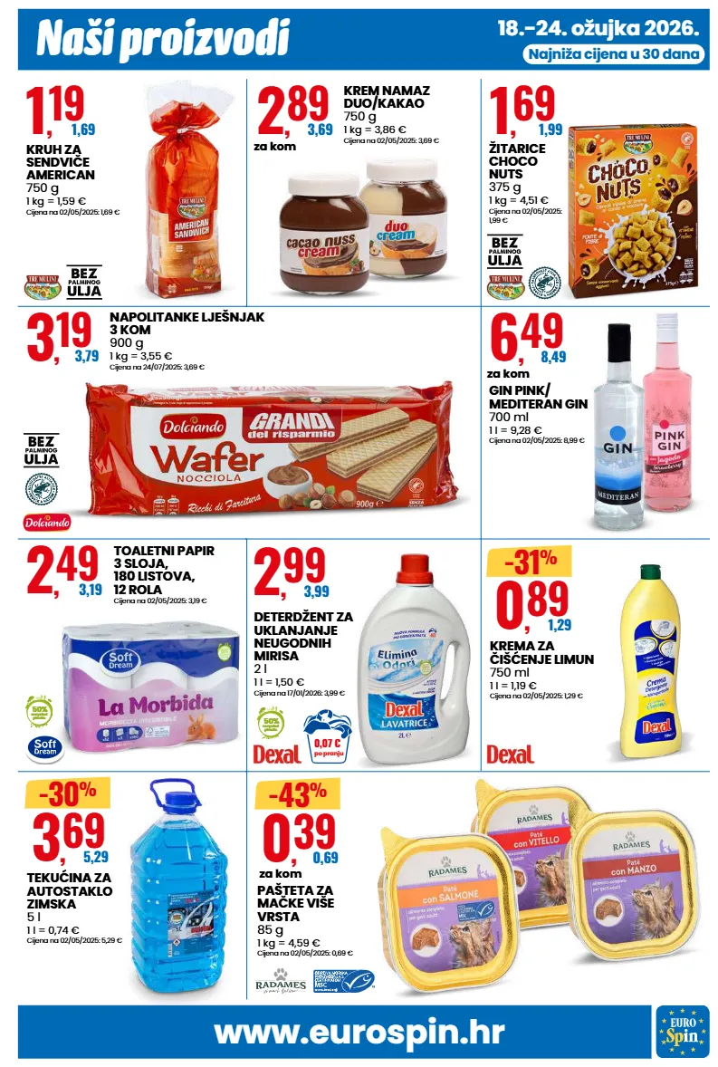 www.eurospin.hr naši proizvodi 18.-24. ožujka 2026. najniža cijena u 30 dana 1 , 19 1,69 kruh za sendviče american 750 g 1 kg = 1,59 € cijena na 02/05/2025: 1,69 € 2 , 89 3,69 za kom krem namaz duo/kakao 750 g 1 kg = 3,86 € cijena na 02/05/2025: 3,69 € 1 , 69 1,99 žitarice choco nuts 375 g 1 kg = 4,51 € cijena na 02/05/2025: 1,99 € 3 , 19 3,79 napolitanke lješnjak 3 kom 900 g 1 kg = 3,55 € cijena na 24/07/2025: 3,69 € 6 , 49 8,49 za kom gin pink/ mediteran gin 700 ml 1 l = 9,28 € cijena na 02/05/2025: 8,99 € 2 , 49 3,19 50% recycled plastic toaletni papir 3 sloja, 180 listova, 12 rola cijena na 02/05/2025: 3,19 € 0 , 89 1,29 -31 % krema za čišćenje limun 750 ml 1 l = 1,19 € cijena na 02/05/2025: 1,29 € 0 , 39 0,69 za kom -43 % pašteta za mačke više vrsta 85 g 1 kg = 4,59 € cijena na 02/05/2025: 0,69 € 3 , 69 5,29 -30 % tekućina za autostaklo zimska 5 l 1 l = 0,74 € cijena na 02/05/2025: 5,29 € 2 , 99 3,99 50% recycled plastic deterdžent za uklanjanje neugodnih mirisa 2 l 1 l = 1,50 € cijena na 17/01/2026: 3,99 € po pranju 0,07 €