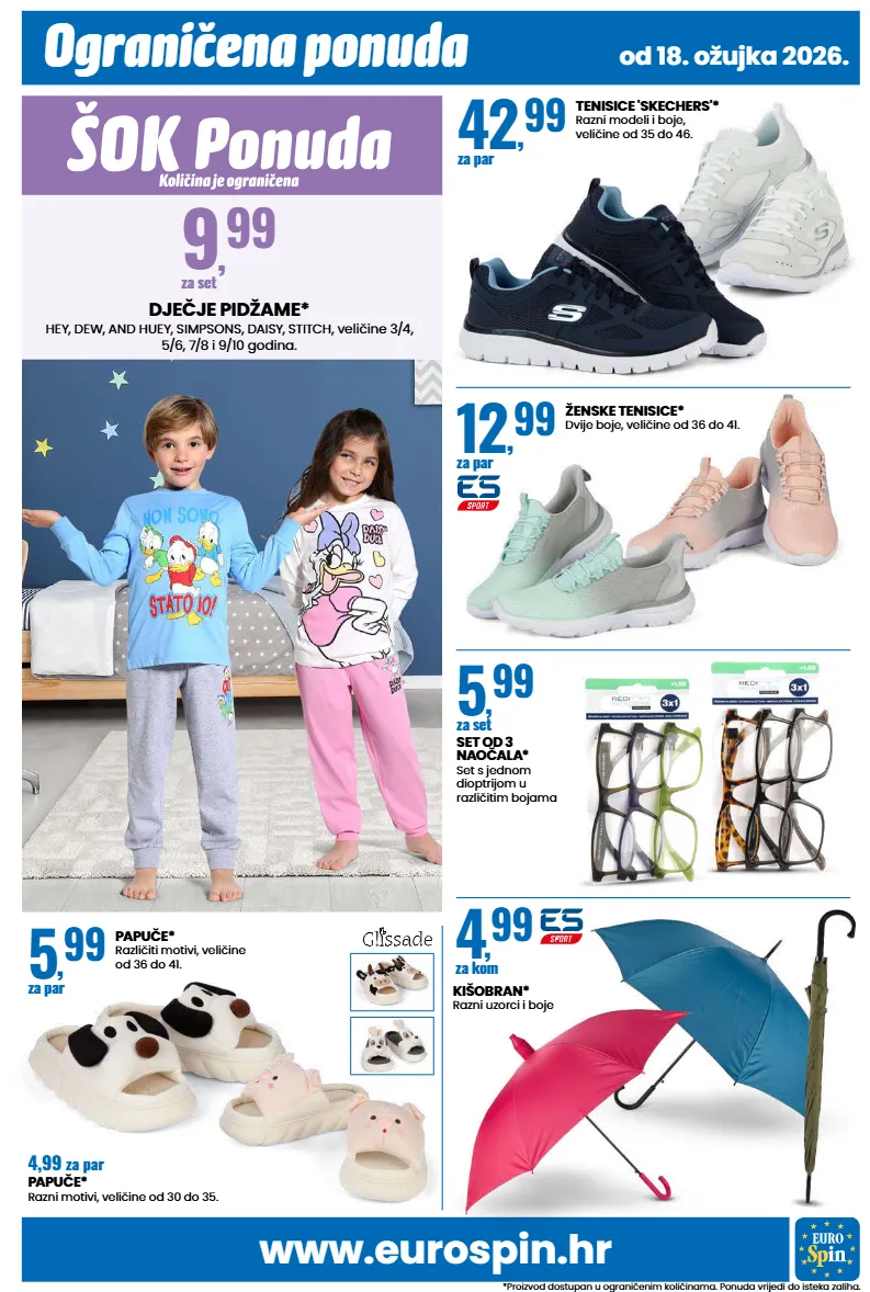 www.eurospin.hr ograničena ponuda *proizvod dostupan u ograničenim količinama. ponuda vrijedi do isteka zaliha. od 18. ožujka 2026. dječje pidžame* hey, dew, and huey, simpsons, daisy, stitch, veličine 3/4, 5/6, 7/8 i 9/10 godina. 9 , 99 za set papuče* različiti motivi, veličine od 36 do 41. 5 , 99 za par tenisice 'skechers'* razni modeli i boje, veličine od 35 do 46. 42 , 99 za par ženske tenisice* dvije boje, veličine od 36 do 41. 12 , 99 za par kišobran* razni uzorci i boje 4 , 99 za kom set od 3 naočala* set s jednom dioptrijom u različitim bojama 5 , 99 za set 4,99 za par papuče* razni motivi, veličine od 30 do 35.