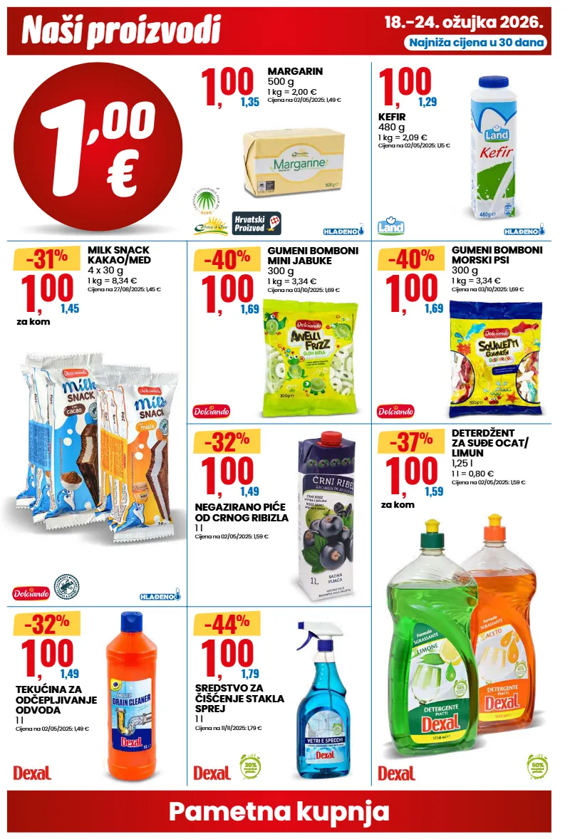 18.-24. ožujka 2026. naši proizvodi pametna kupnja najniža cijena u 30 dana 1 , 00 1,35 margarin 500 g 1 kg = 2,00 € cijena na 02/05/2025: 1,49 € 1 , 00 1,45 za kom -31 % milk snack kakao/med 4 x 30 g 1 kg = 8,34 € cijena na 27/08/2025: 1,45 € 1 , 00 1,29 kefir 480 g 1 kg = 2,09 € cijena na 02/05/2025: 1,15 € 1 , 00 1,69 -40 % gumeni bomboni morski psi 300 g 1 kg = 3,34 € cijena na 03/10/2025: 1,69 € 1 , 00 1,69 -40 % gumeni bomboni mini jabuke 300 g 1 kg = 3,34 € cijena na 03/10/2025: 1,69 € 1 , 00 1,49 -32 % negazirano piće od crnog ribizla 1 l cijena na 02/05/2025: 1,59 € 1 , 00 1,59 za kom 50% recycled plastic -37 % deterdžent za suðe ocat/ limun 1,25 l 1 l = 0,80 € cijena na 02/05/2025: 1,59 € 1 , 00 1,49 -32 % tekućina za odčepljivanje odvoda 1 l cijena na 02/05/2025: 1,49 € 1 , 00 1,79 30% recycled plastic -44 % sredstvo za čišćenje stakla sprej 1 l cijena na 11/11/2025: 1,79 €