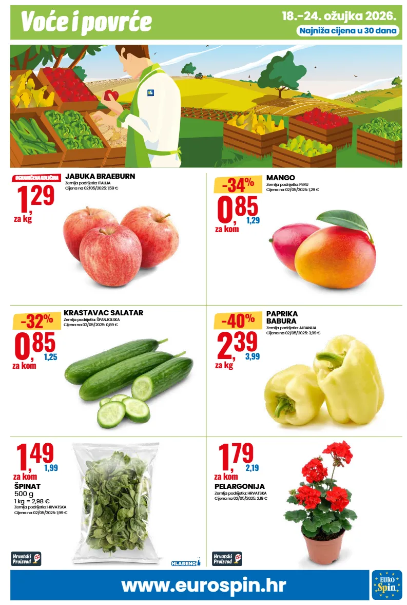 www.eurospin.hr voće i povrće 18.-24. ožujka 2026. najniža cijena u 30 dana pelargonija zemlja podrijetla: hrvatska cijena na 02/05/2025: 2,19 € 1 , 79 2,19 za kom špinat 500 g 1 kg = 2,98 € zemlja podrijetla: hrvatska cijena na 02/05/2025: 1,99 € 1 , 49 1,99 za kom jabuka braeburn zemlja podrijetla: italija cijena na 02/05/2025: 1,59 € 1 , 29 za kg ograničena količina krastavac salatar zemlja podrijetla: španjolska cijena na 02/05/2025: 0,89 € 0 , 85 1,25 za kom -32 % mango zemlja podrijetla: peru cijena na 02/05/2025: 1,29 € 0 , 85 1,29 za kom -34 % paprika babura zemlja podrijetla: albanija cijena na 02/05/2025: 3,99 € 2 , 39 3,99 za kg -40 %