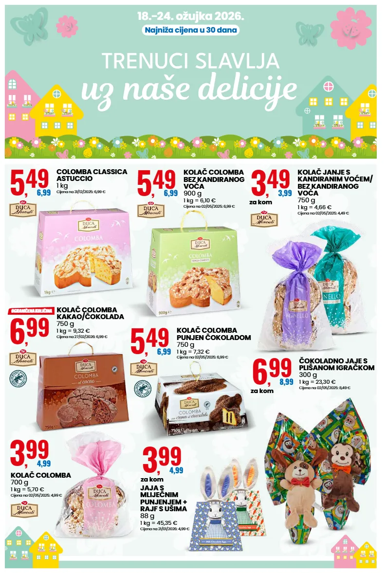 18.-24. ožujka 2026. Najniža cijena u 30 dana 5 , 49 6,99 COLOMBA CLASSICA ASTUCCIO 1 kg Cijena na 31/12/2025: 6,99 € 5 , 49 6,99 KOLAČ COLOMBA BEZ KANDIRANOG VOĆA 900 g 1 kg = 6,10 € Cijena na 02/05/2025: 6,99 € 5 , 49 6,99 KOLAČ COLOMBA PUNJEN ČOKOLADOM 750 g 1 kg = 7,32 € Cijena na 02/05/2025: 6,99 € 6 , 99 OGRANIČENA KOLIČINA KOLAČ COLOMBA KAKAO/ČOKOLADA 750 g 1 kg = 9,32 € Cijena na 27/02/2026: 6,99 € 3 , 99 4,99 KOLAČ COLOMBA 700 g 1 kg = 5,70 € Cijena na 02/05/2025: 4,99 € 3 , 49 3,99 za kom KOLAČ JANJE S KANDIRANIM VOĆEM/ BEZ KANDIRANOG VOĆA 750 g 1 kg = 4,66 € Cijena na 02/05/2025: 4,49 € 6 , 99 8,99 za kom ČOKOLADNO JAJE S PLIŠANOM IGRAČKOM 300 g 1 kg = 23,30 € Cijena na 02/05/2025: 8,49 € 3 , 99 4,99 za kom JAJA S MLIJEČNIM PUNJENJEM + RAJF S UŠIMA 88 g 1 kg = 45,35 € Cijena na 21/01/2026: 4,99 €
