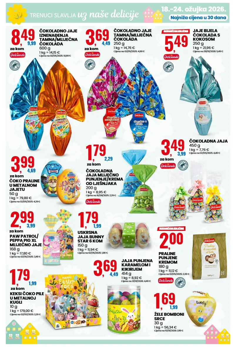18.-24. ožujka 2026. najniža cijena u 30 dana 8 , 49 9,99 za kom čokoladno jaje iznenađenja tamna/mliječna čokolada 600 g 1 kg = 14,15 € cijena na 02/05/2025: 10,99 € 3 , 69 4,49 za kom čokoladno jaje tamna/mliječna čokolada 250 g 1 kg = 14,76 € cijena na 02/05/2025: 4,99 € 1 , 79 1,99 za kom keksi čoko pile u metalnoj kugli 10 g 1 kg = 179,00 € cijena na 02/05/2025: 2,29 € 3 , 49 3,99 za kom čokoladna jaja 450 g 1 kg = 7,76 € cijena na 02/05/2025: 4,49 € 3 , 69 4,49 jaja punjena karamelom i kikirijem 414 g 1 kg = 8,92 € cijena na 21/01/2026: 4,49 € 2 , 99 3,99 za kom paw patrol/ peppa pig xl mliječno jaje 168 g 1 kg = 17,80 € cijena na 02/05/2025: 3,49 € 1 , 79 1,99 uskrsna jaja bunny star 6 kom 150 g 1 kg = 11,94 € cijena na 02/05/2025: 1,99 € 3 , 99 4,69 za kom čoko praline u metalnom jajetu 50 g 1 kg = 79,80 € cijena na 02/05/2025: 4,29 € 1 , 79 2,29 za kom čokoladna jaja mliječno punjenje/krema od lješnjaka 200 g 1 kg = 8,95 € cijena na 16/09/2025: 2,29 € 1 , 69 1,99 žele bomboni srce 30 g 1 kg = 56,34 € cijena na 15/01/2026: 1,99 € 5 , 49 ograničena količina jaje bijela čokolada s kokosom 250 g 1 kg = 21,96 € cijena na 28/01/2026: 5,49 € 2 , 00 ograničena količina praline punjene kremom 180 g 1 kg = 11,12 € cijena na 02/05/2025: 2,39 €