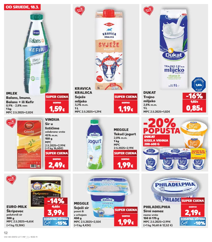 kratkotrajna ponuda kratkotrajna ponuda kratkotrajna ponuda kratkotrajna ponuda samo kratkotrajna ponuda samo samo kratkotrajna ponuda samo samo samo kratkotrajna ponuda kratkotrajna ponuda samo od srijede, 18.3. meggle tekući jogurt 2,8% m.m. 1 kg mpc 2.5.2025=2,19€ vindija sir u listićima odabrane vrste 45% m.m. 150 g mpc 2.5.2025=2,99€ (=1 kg 16,60€) super cijena super cijena -16% dukat trajno mlijeko 2,8% m.m. 1 l mpc 2.5.2025=1,02€ super cijena 1,59 € imlek balans, imuno, balans + ili kefir 0,9% - 2,8% mm 1 kg mpc 2.5.2025=2,02€ super cijena 1,99 € samo 2,49 € samo meggle svježi sir posni ili s vrhnjem 450 g mpc 2.5.2025=2,55€ (=1 kg 4,43€) super cijena 1,99 € samo 0,85 € 1,02 € samo 1,19 € samo kravica kraljica svježe mlijeko 3,2% m.m. 1 l mpc 2.5.2025=1,29€ dukat kisela vrhnja 200-600 g -20% popusta (=1 kg 14,60 ili 12,52 €) philadelphia sirni namaz razne vrste 150 ili 175 g mpc 2.5.2025=2,99€ (=1 kg 13,30€) euro-milk škripavac polutvrdi sir 300 g mpc 2.5.2025=4,65€ samo 2,19 € super cijena sa o 2,19 sam 2,19 sam 2,19 sam 2,19 sam sam € o € o -14% 3,99 € 4,65 € -15% dodatna ušteda -10% dodatna ušteda 1,03 € s12-hr-kw12-lft-mp_1_l-1030-11 12
