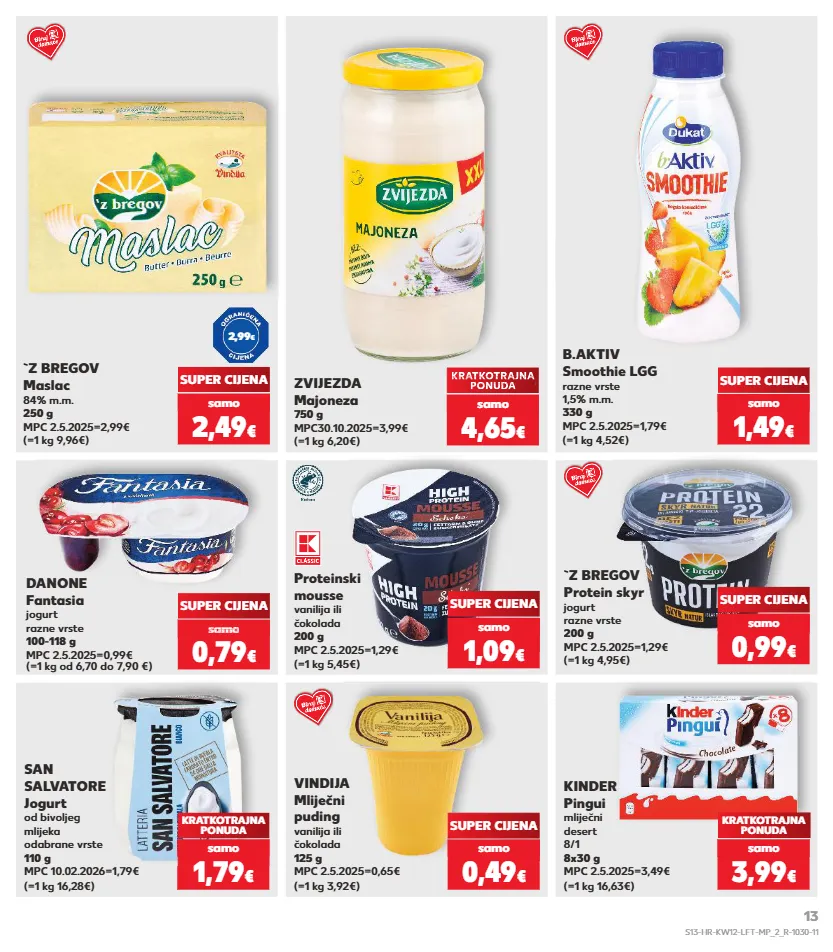 kratkotrajna ponuda kratkotrajna ponuda kratkotrajna ponuda kratkotrajna ponuda samo samo samo samo kratkotrajna ponuda samo samo samo samo kratkotrajna ponuda b.aktiv smoothie lgg razne vrste 1,5% m.m. 330 g mpc 2.5.2025=1,79€ (=1 kg 4,52€) proteinski mousse vanilija ili čokolada 200 g mpc 2.5.2025=1,29€ (=1 kg 5,45€) super cijena `z bregov protein skyr jogurt razne vrste 200 g mpc 2.5.2025=1,29€ (=1 kg 4,95€) super cijena super cijena san salvatore jogurt od bivoljeg mlijeka odabrane vrste 110 g mpc 10.02.2026=1,79€ (=1 kg 16,28€) kratkotrajna ponuda (=1 kg 9,96€) `z bregov maslac 84% m.m. 250 g mpc 2.5.2025=2,99€ super cijena 1,49 € samo 0,99 € samo 1,09 € samo 1,79 € samo vindija mliječni puding vanilija ili čokolada 125 g mpc 2.5.2025=0,65€ (=1 kg 3,92€) kinder pingui mliječni desert 8/1 8x30 g mpc 2.5.2025=3,49€ (=1 kg 16,63€) super cijena kratkotrajna ponuda 0,49 € samo 3,99 € samo 2,49 € samo (=1 kg 6,20€) zvijezda majoneza 750 g mpc30.10.2025=3,99€ kratkotrajna ponuda kratkotrajna ponuda super cijena kratkotrajna super cijena super cijena kratkotrajna ponuda super cijena super cijena ponuda 4,65 € samo (=1 kg od 6,70 do 7,90 €) danone fantasia jogurt razne vrste 100-118 g mpc 2.5.2025=0,99€ samo 0,79 € super cijena sa o 0,69 samo 0,69 samo 0,6 samo 0,69 sam samo € o € o 2,99 € s13-hr-kw12-lft-mp_2_r-1030-11 13