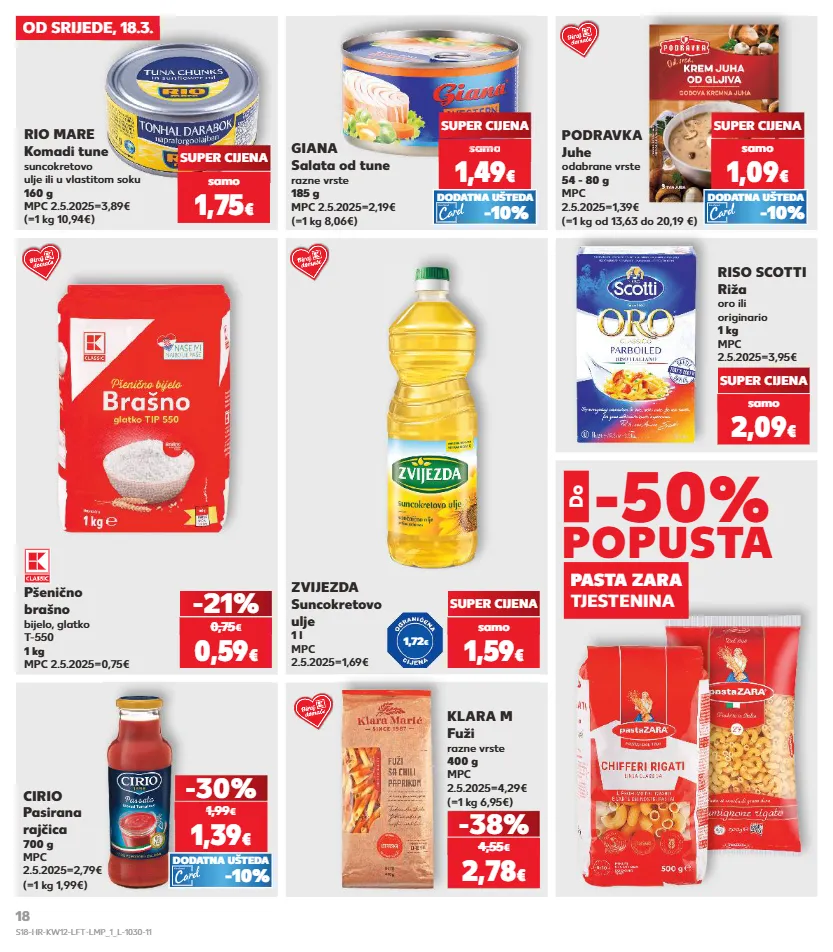 1,09 € kratkotrajna ponuda kratkotrajna ponuda kratkotrajna ponuda kratkotrajna ponuda samo kratkotrajna ponuda samo kratkotrajna ponuda samo kratkotrajna ponuda kratkotrajna ponuda od srijede, 18.3. zvijezda suncokretovo ulje 1 l mpc 2.5.2025=1,69€ pšenično brašno bijelo, glatko t-550 1 kg mpc 2.5.2025=0,75€ riso scotti riža oro ili originario 1 kg mpc 2.5.2025=3,95€ klara m fuži razne vrste 400 g mpc 2.5.2025=4,29€ (=1 kg 6,95€) -38% super cijena samo 1,75 € (=1 kg 10,94€) rio mare komadi tune suncokretovo ulje ili u vlastitom soku 160 g mpc 2.5.2025=3,89€ super cijena samo 1,59 € -21% 0,59 € 0,75 € super cijena samo 2,09 € 2,78 € 4,55 € -50 % popusta pasta zara tjestenina do (=1 kg 1,99€) cirio pasirana rajčica 700 g mpc 2.5.2025=2,79€ (=1 kg 8,06€) giana salata od tune razne vrste 185 g mpc 2.5.2025=2,19€ 1,39 € -30% 1,99 € samo super cijena 1,49 € sa o 1,49 sam 1,49 sam 1,4 sam 1,49 sam sam € o € o -10% dodatna ušteda -10% dodatna ušteda (=1 kg od 13,63 do 20,19 €) podravka juhe odabrane vrste 54 - 80 g mpc 2.5.2025=1,39€ samo 1,09 € super cijena -10% dodatna ušteda 1,72 € s18-hr-kw12-lft-lmp_1_l-1030-11 18