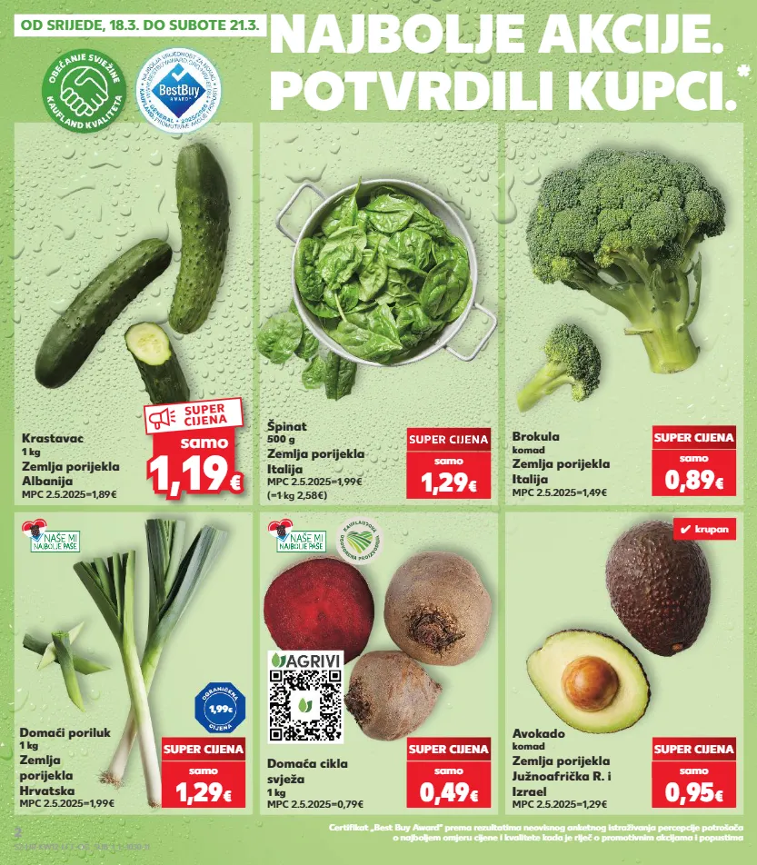 -37% 0,79 € -25% 1,19 € kratkotrajna ponuda kratkotrajna ponuda kratkotrajna ponuda kratkotrajna ponuda od srijede, 18.3. do subote 21.3. brokula komad zemlja porijekla italija mpc 2.5.2025=1,49€ domaći poriluk 1 kg zemlja porijekla hrvatska mpc 2.5.2025=1,99€ domaća cikla svježa 1 kg mpc 2.5.2025=0,79€ avokado komad zemlja porijekla južnoafrička r. i izrael mpc 2.5.2025=1,29€ super cijena super cijena super cijena super cijena (=1 kg 2,58€) špinat 500 g zemlja porijekla italija mpc 2.5.2025=1,99€ krastavac 1 kg zemlja porijekla albanija mpc 2.5.2025=1,89€ samo 0,89 € samo 1,29 € samo 0,49 € samo 0,95 € kratkotrajna ponuda super cijena super cijena super cijena - - super cijena 7% super cijena 7% 7% super cijena samo 1,29 € 1,99 € najbolje akcije. potvrdili kupci. * certifikat „best buy award“ prema rezultatima neovisnog anketnog istraživanja percepcije potrošača o najboljem omjeru cijene i kvalitete kada je riječ o promotivnim akcijama i popustima ✓ krupan 1,19 1,19 € € samo super cijena s2-hr-kw12-lft-og_sub_1_l-1030-11 2