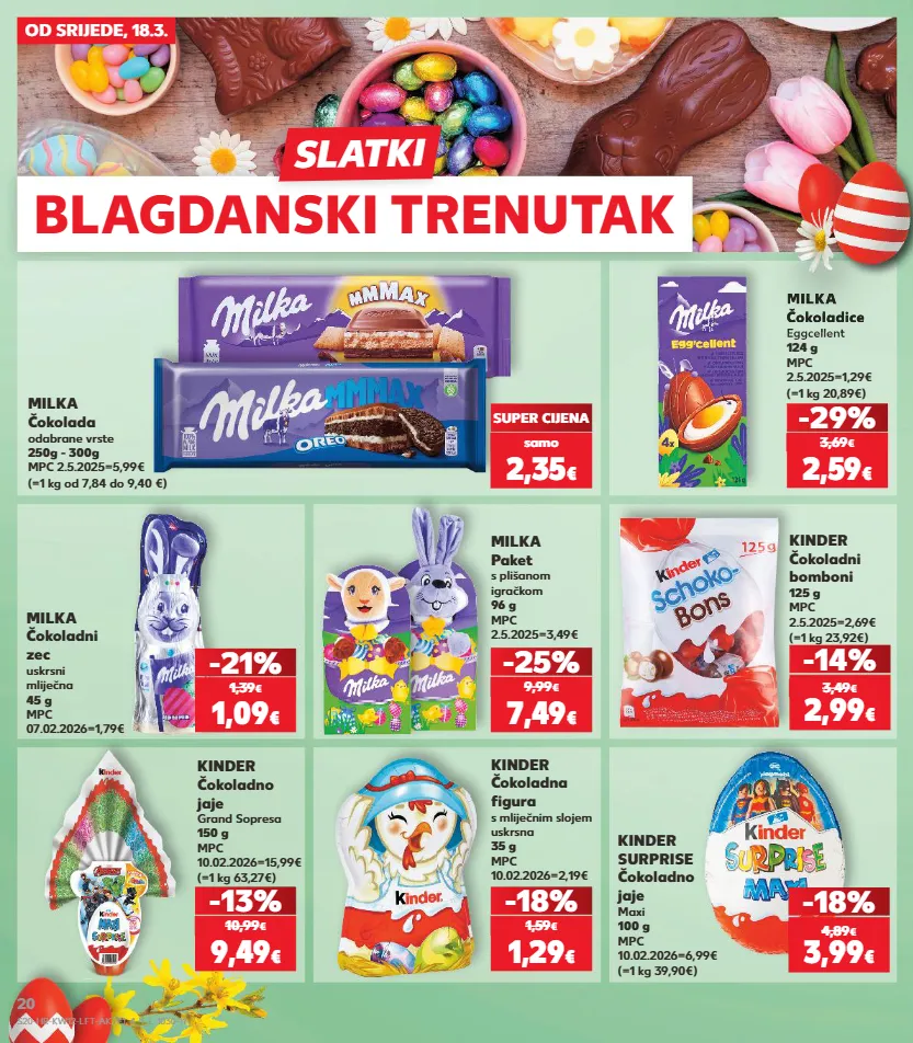 samo kratkotrajna ponuda kratkotrajna ponuda kratkotrajna ponuda kratkotrajna ponuda samo kratkotrajna ponuda samo samo kratkotrajna ponuda samo samo kratkotrajna ponuda samo kratkotrajna ponuda od srijede, 18.3. kinder čokoladni bomboni 125 g mpc 2.5.2025=2,69€ (=1 kg 23,92€) milka čokolada odabrane vrste 250g - 300g mpc 2.5.2025=5,99€ (=1 kg od 7,84 do 9,40 €) kinder čokoladno jaje grand sopresa 150 g mpc 10.02.2026=15,99€ (=1 kg 63,27€) kinder surprise čokoladno jaje maxi 100 g mpc 10.02.2026=6,99€ (=1 kg 39,90€) kinder čokoladna figura s mliječnim slojem uskrsna 35 g mpc 10.02.2026=2,19€ -14% -13% -18% milka paket s plišanom igračkom 96 g mpc 2.5.2025=3,49€ kratkotrajna ponuda super cijena kratkotrajna super cijena super cijena kratkotrajna ponuda super cijena super cijena ponuda -25% 7,49 € 9,99 € milka čokoladice eggcellent 124 g mpc 2.5.2025=1,29€ (=1 kg 20,89€) -29% 2,59 € 3,69 € 2,99 € 3,49 € super cijena samo 2,35 € 9,49 € 10,99 € 3,99 € 4,89 € -18% 1,29 € 1,59 € milka čokoladni zec uskrsni mliječna 45 g mpc 07.02.2026=1,79€ 1,39 € 1,09 € -21% blagdanski trenutak slatki milka čokoladice eggcellent milka čokoladice s20-hr-kw12-lft-aktf1_4_1_l-1030-11 20