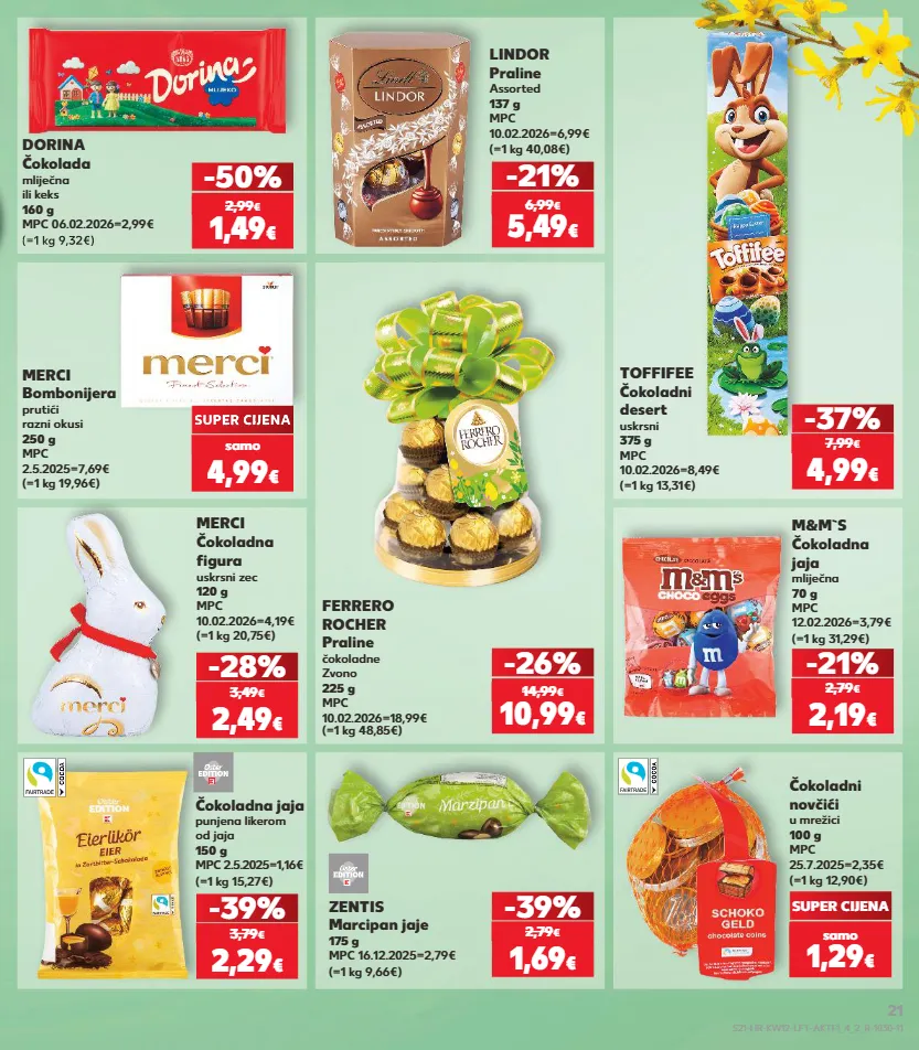 kratkotrajna ponuda kratkotrajna ponuda kratkotrajna ponuda kratkotrajna ponuda kratkotrajna ponuda kratkotrajna ponuda kratkotrajna ponuda samo samo kratkotrajna ponuda samo samo kratkotrajna ponuda samo samo samo samo čokoladna jaja punjena likerom od jaja 150 g mpc 2.5.2025=1,16€ (=1 kg 15,27€) lindor praline assorted 137 g mpc 10.02.2026=6,99€ (=1 kg 40,08€) -21% -39% ferrero rocher praline čokoladne zvono 225 g mpc 10.02.2026=18,99€ (=1 kg 48,85€) m&m`s čokoladna jaja mliječna 70 g mpc 12.02.2026=3,79€ (=1 kg 31,29€) -21% zentis marcipan jaje 175 g mpc 16.12.2025=2,79€ (=1 kg 9,66€) čokoladni novčići u mrežici 100 g mpc 25.7.2025=2,35€ (=1 kg 12,90€) toffifee čokoladni desert uskrsni 375 g mpc 10.02.2026=8,49€ (=1 kg 13,31€) super cijena -37% (=1 kg 9,32€) dorina čokolada mliječna ili keks 160 g mpc 06.02.2026=2,99€ -50% (=1 kg 20,75€) merci čokoladna figura uskrsni zec 120 g mpc 10.02.2026=4,19€ -28% (=1 kg 19,96€) merci bombonijera prutići razni okusi 250 g mpc 2.5.2025=7,69€ 5,49 € 6,99 € 2,29 € 3,79 € -26% 10,99 € 14,99 € 2,19 € 2,79 € -39% 1,69 € 2,79 € samo 1,29 € 4,99 € 7,99 € 1,49 € 2,99 € 2,49 € 3,49 € kratkotrajna ponuda super cijena super cijena samo 4,99 € (=1 kg 9,32€) s21-hr-kw12-lft-aktf1_4_2_r-1030-11 21
